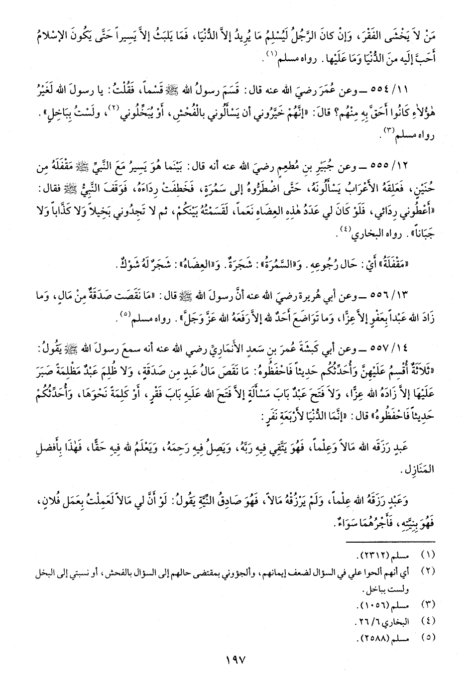 12/555-وعن جُبَيْرِ بنِ مُطعِم رضيَ اللَّه عنه أَنه قَالَ: بَيْنَمَا هُوَ يسِيرُ مَعَ النَّبِيِّ صَلّى اللهُ عَلَيْهِ وسَلَّم مَقْفَلَهُ مِن حُنَيْنٍ، فَعَلِقَهُ الأَعْرَابُ يسَأَلُونَهُ، حَتَّى اضْطَرُّوهُ إِلى سَمُرَةٍ فَخَطَفَتْ رِدَاءَهُ، فَوَقَفَ النَّبِيُّ صَلّى اللهُ عَلَيْهِ وسَلَّم فقال: "أَعْطُوني رِدَائِي، فَلَوْ كَانَ لِي عَدَدُ هذِهِ العِضَاهِ نَعَماً، لَقَسَمْتُهُ بَيْنَكُمْ، ثُمَّ لا تَجِدُوني بَخِيلاً وَلا كَذَّاباً وَلا جَبَاناً" رواه البخاري.