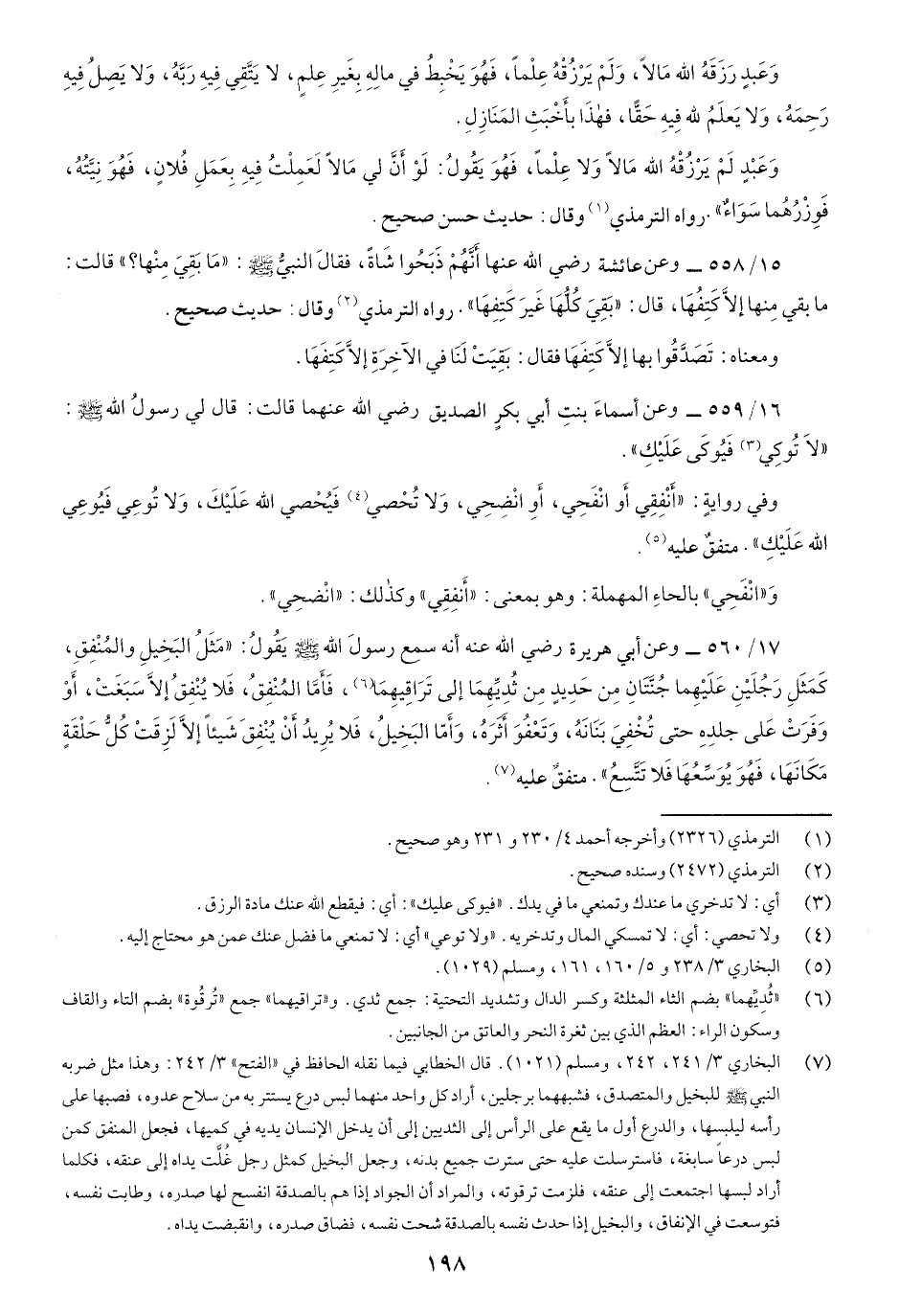 16/559-وعن أَسماءَ بنتِ أَبي بكرٍ الصديق رضي اللَّه عنهما قالت: قَالَ لي رسولُ اللَّه صَلّى اللهُ عَلَيْهِ وسَلَّم: "لاَ تُوكِي فيُوكَى عليكِ".