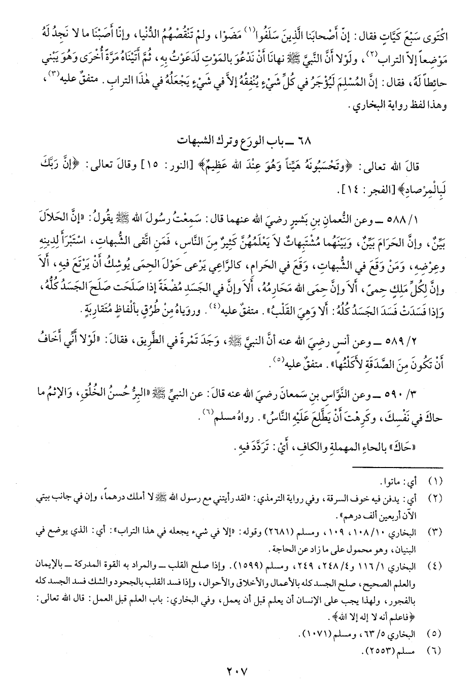 1/588- وعن النُّعمان بنِ بَشيرٍ رضيَ اللَّه عنهما قال: سمِعْتُ رسُولَ اللَّهِ صَلّى اللهُ عَلَيْهِ وسَلَّم يَقُولُ: "إِنَّ الحَلاَلَ بَيِّنٌ، وإِنَّ الحَرامَ بَيِّنٌ، وَبَيْنَهما مُشْتَبِهاتٌ لاَ يَعْلَمُهُنَّ كَثِيرٌ مِنَ النَّاسِ، فَمَن اتَّقى الشُّبُهاتِ، اسْتَبْرَأَ لِدِينِهِ وعِرْضِهِ، وَمَنْ وَقَعَ فِي الشبُهاتِ، وقَعَ في الحَرامِ، كالرَّاعي يرْعى حَوْلَ الحِمى يُوشِكُ أَنْ يَرْتَع فِيهِ، أَلاَ وإِنَّ لِكُلِّ مَلِكٍ حِمًى، أَلاَ وَإِنَّ حِمَى اللَّهِ مَحَارِمهُ، أَلاَ وإِنَّ فِي الجسَدِ مُضغَةً إِذَا صلَحَت صَلَحَ الجسَدُ كُلُّهُ، وَإِذا فَسَدَتْ فَسدَ الجَسَدُ كُلُّهُ: أَلاَ وَهِي القَلْبُ" متفقٌ عَلَيْهِ. ورَوَياه مِنْ طُرُقٍ بأَلْفاظٍ مُتَقارِبَةٍ.