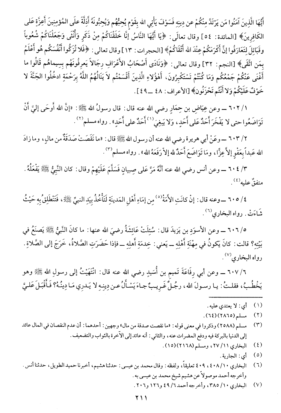 1/602- وعن عِيَاضِ بنِ حِمَارٍ رضي اللَّه عنه قَالَ: قالَ رسول اللَّه صَلّى اللهُ عَلَيْهِ وسَلَّم: "إِن اللَّه أَوحَى إِليَّ أَنْ تَواضَعُوا حَتَّى لاَ يَفْخَرَ أَحَدٌ عَلى أَحدٍ، وَلاَ يَبغِيَ أَحَدٌ عَلَى أَحَدٍ "رواه مسلم.
