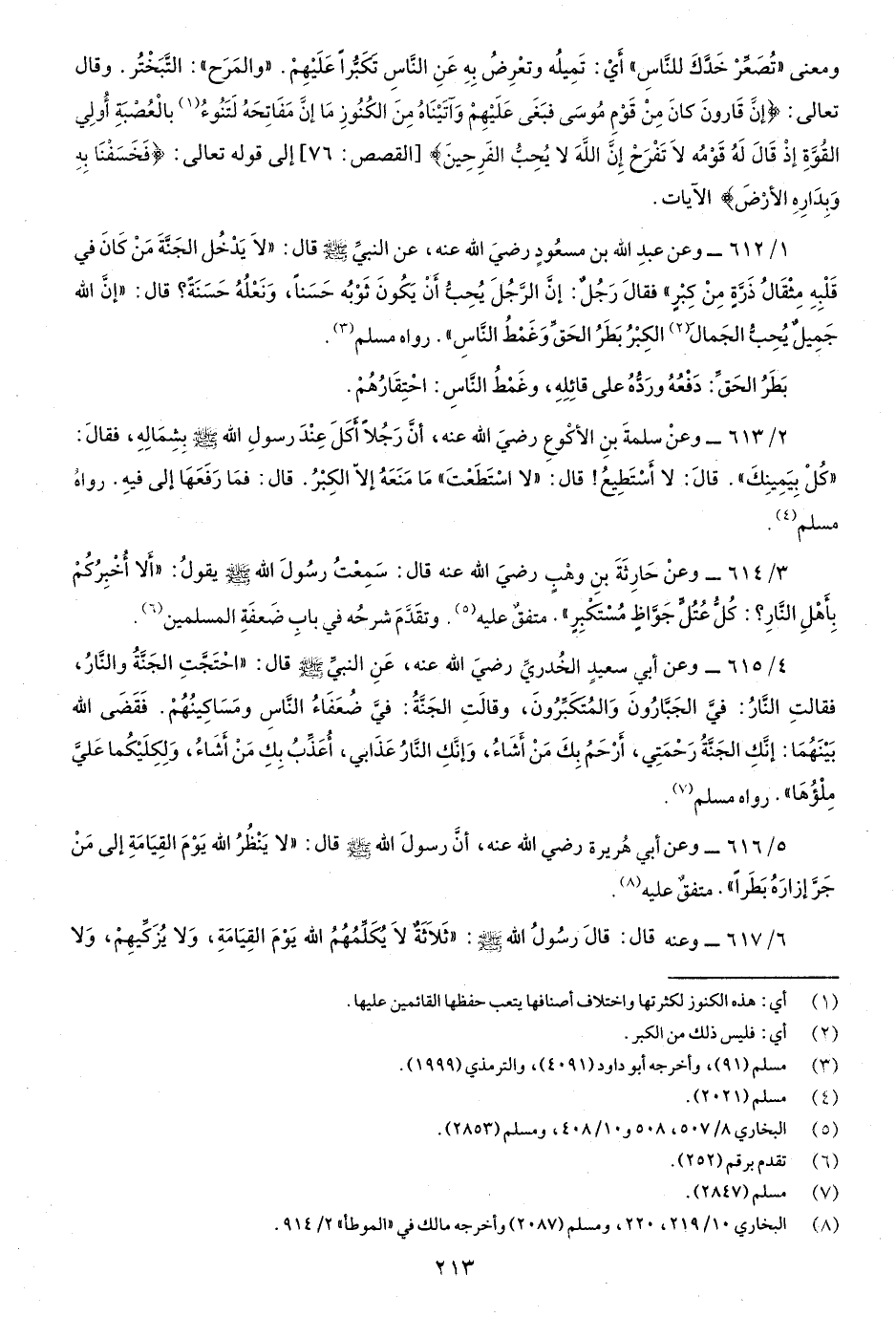 1/612- وعن عبدِ اللَّهِ بن مسعُودٍ رضيَ اللَّهُ عنه، عن النبيِّ صَلّى اللهُ عَلَيْهِ وسَلَّم قَالَ: "لاَ يَدْخُل الجَنَّةَ مَنْ كَانَ في قَلْبِهِ مثْقَالُ ذَرَّةٍ مَنْ كِبرٍ"فَقَالَ رَجُلٌ: إِنَّ الرَّجُلَ يُحِبُّ أَنْ يَكُونَ ثَوْبُه حَسَناً، ونعلهُ حَسَنَةً؟ قَالَ:"إِنَّ اللَّه جَمِيلٌ يُحِبُّ الجَمالَ الكِبْرُ بَطَرُ الحَقِّ وغَمْطُ النَّاسِ "رواه مسلم.