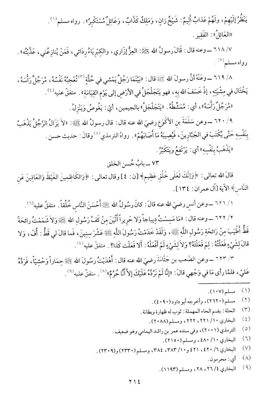 8/619- وعنْه أَنَّ رسولَ اللَّهِ صَلّى اللهُ عَلَيْهِ وسَلَّم قَالَ: "بيْنَمَا رَجُلٌ يَمْشِي في حُلَّةٍ تُعْجِبُه نفْسُه، مرَجِّلٌ رأسَه، يَخْتَالُ فِي مَشْيَتِهِ، إِذْ خَسَفَ اللَّهُ بِهِ، فَهُوَ يَتَجَلْجَلُ في الأَرْضِ إِلَى يوْمِ القِيامةِ" متفقٌ عَلَيْهِ.
