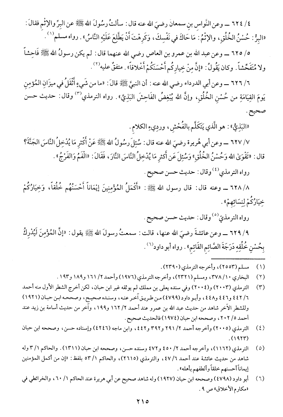 4/624- وعن النَّوَّاسِ بنِ سمعانَ رضي اللَّه عنه قَالَ: سأَلتُ رسُولَ اللَّهِ صَلّى اللهُ عَلَيْهِ وسَلَّم عنِ البِرِّ والإِثمِ فقالَ: "البِرُّ حُسنُ الخُلُقِ، والإِثمُ: مَا حاكَ فِي نَفْسِكَ، وكَرِهْتَ أَنْ يَطَّلعَ عَلَيْهِ النَّاسُ" رواهُ مسلم.
