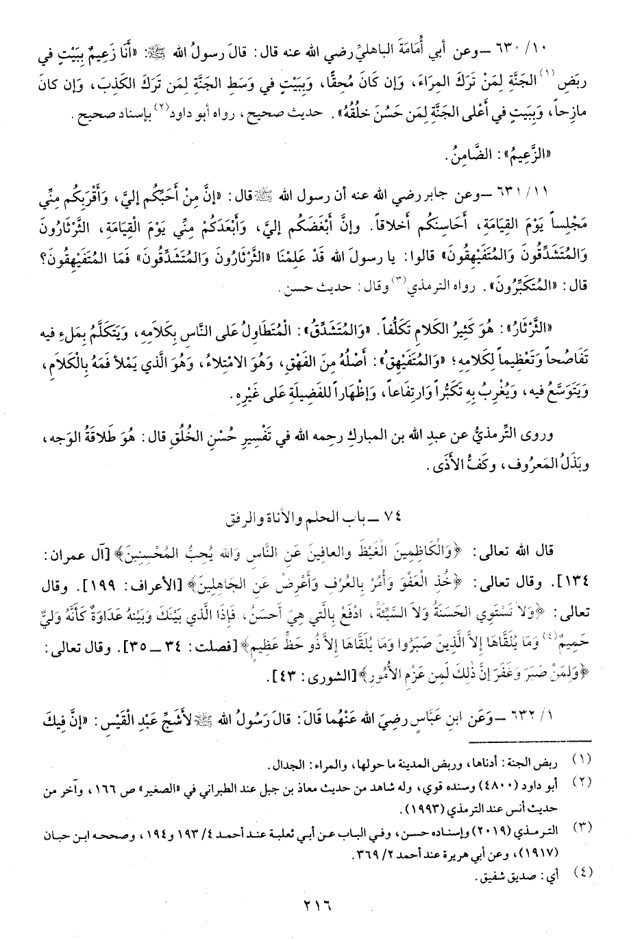 10/630- وعن أَبي أُمَامَة الباهِليِّ رضي اللَّه عنه قَالَ: قَالَ رَسُولُ اللَّه صَلّى اللهُ عَلَيْهِ وسَلَّم: "أَنا زَعِيمٌ ببَيتٍ في ربَضِ الجنَّةِ لِمَنْ تَرَكَ المِراءَ. وَإِنْ كَانَ مُحِقّاً، وَببيتٍ في وَسَطِ الجنَّةِ لِمَنْ تَرَكَ الكَذِبَ، وإِن كَانَ مازِحاً، وَببيتٍ في أعلَى الجَنَّةِ لِمَن حَسُنَ خُلُقُهُ" حديث صحيح، رواه أَبُو داود بإِسناد صحيح.