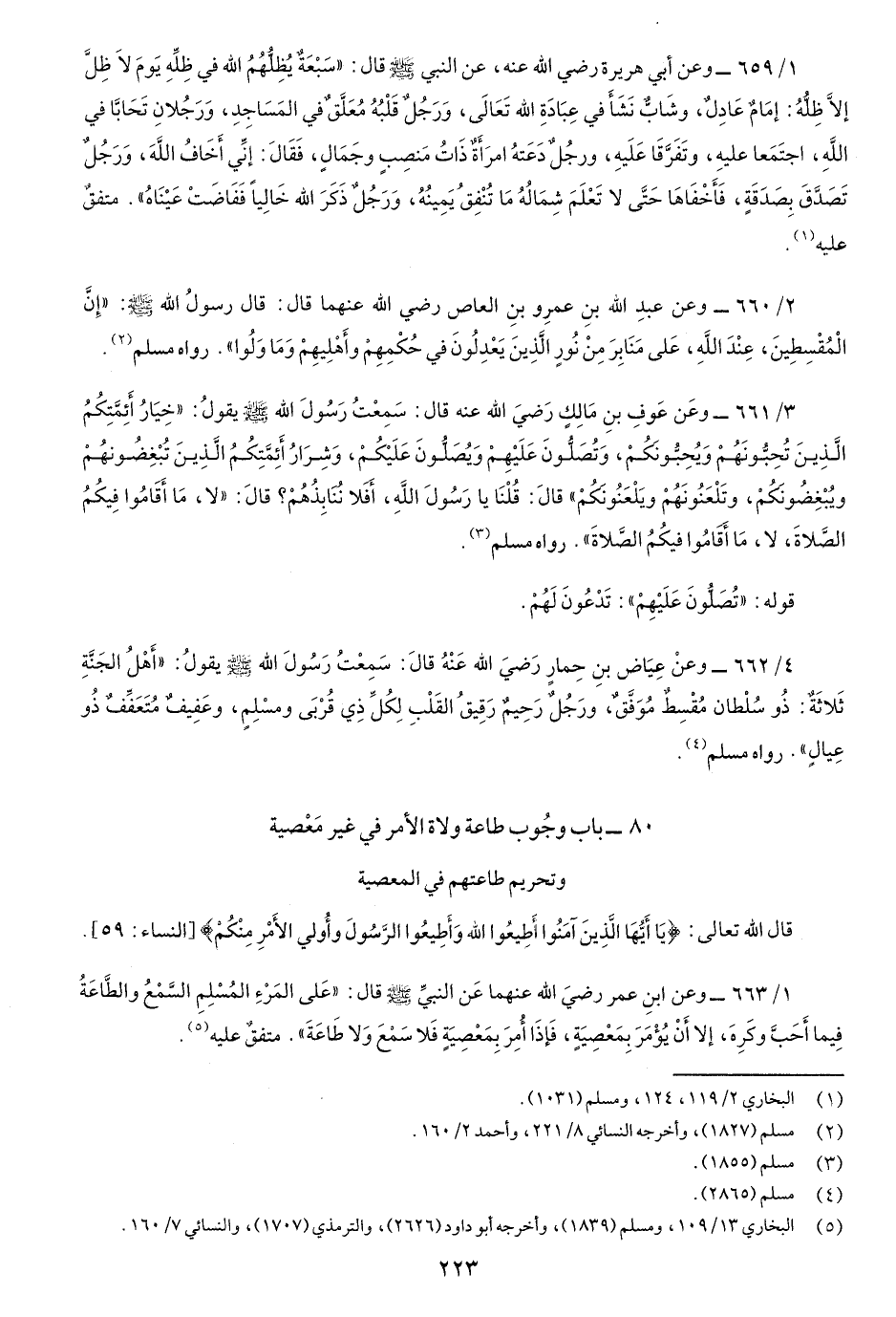 1/659- وعن أَبي هريرة رضي اللَّه عنه، عن النَّبيّ صَلّى اللهُ عَلَيْهِ وسَلَّم قَالَ:"سَبْعَةٌ يُظِلُّهُمُ اللَّه في ظِلِّهِ يومَ لاَ ظِلَّ إلاَّ ظِلُّهُ: إمَامٌ عادِلٌ، وشَابٌّ نَشَأَ في عِبادَةِ اللَّهِ تَعالى، ورَجُلٌ مُعَلَّقٌ قَلبُهُ في المَسَاجِدِ، ورجُلانِ تَحَابَّا في اللَّه، اجتَمعَا عليهِ، وتَفرَّقَا علَيهِ، ورجُلٌ دعَتهُ امرَأَةٌ ذَاتُ مَنصِب وجمَالٍ، فقَال: إنِّى أَخَافُ اللَّه، ورَجُلٌ تَصَدَّقَ بِصدقةٍ، فَأَخْفَاها حَتَّى لاَ تَعلَمَ شِمالُهُ مَا تُنفِقُ يميِنُهُ، ورَجُلٌ ذَكَر اللَّه خَالِياً فَفَاضَتْ عينَاهُ" متفقٌ عَلَيْهِ.