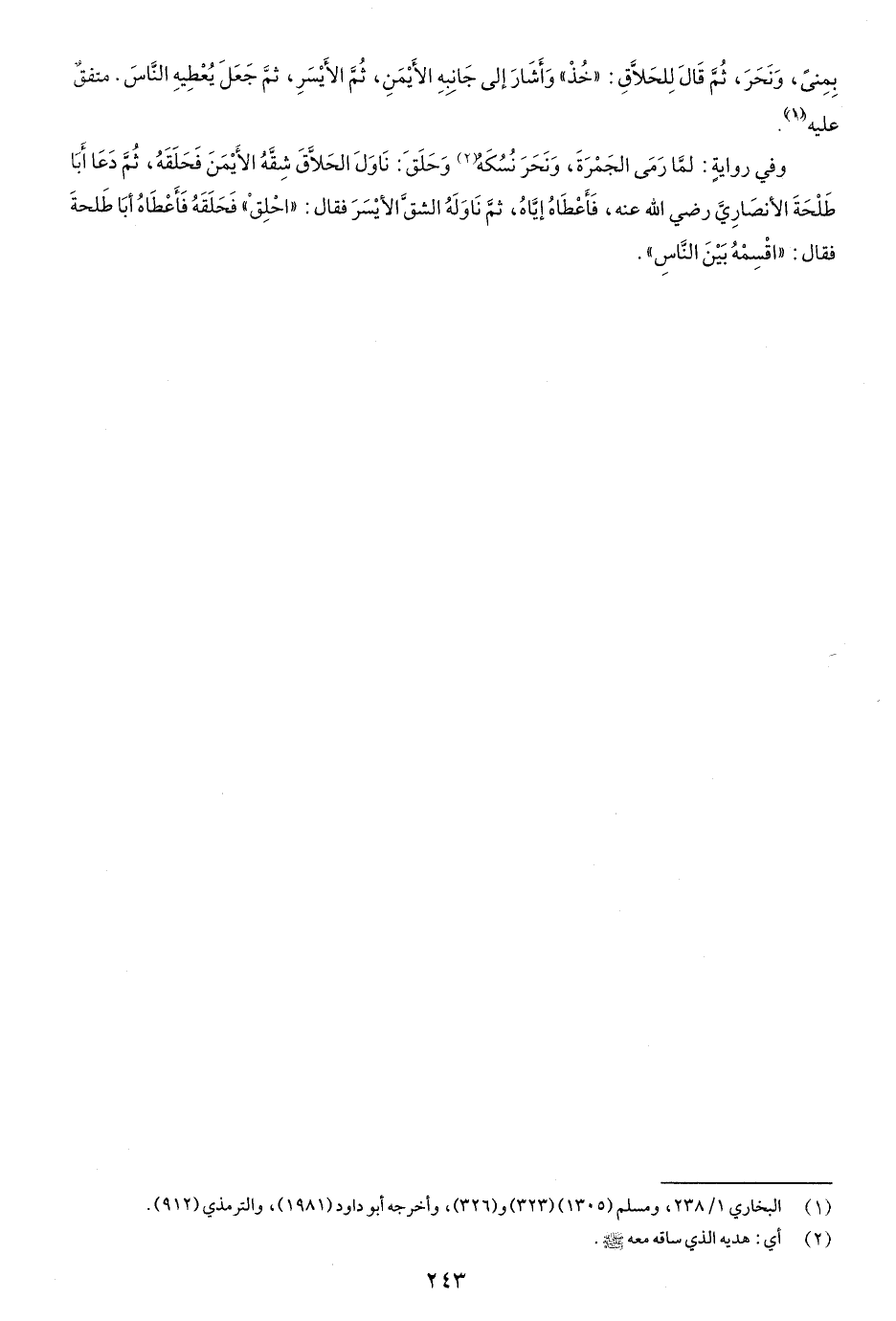 وفي روايةٍ: لمَّا رمَى الجمْرةَ، ونَحَر نُسُكَهُ وَحَلَقَ: نَاوَل الحلاقَ شِقَّهُ الأَيْمنَ فَحلَقَه، ثُمَّ دعَا أَبَا طَلحةَ الأَنصاريَّ رضي اللَّه عنه، فَأَعطَاهُ إِيَّاهُ، ثُمَّ نَاوَلهُ الشقَّ الأَيْسَرَ فَقَالَ: "احْلِقْ"فَحلَقَهُ فَأَعْطاهُ أَبا طَلْحَةَ فَقَالَ:"اقسِمْهُ بَيْنَ النَّاس".
