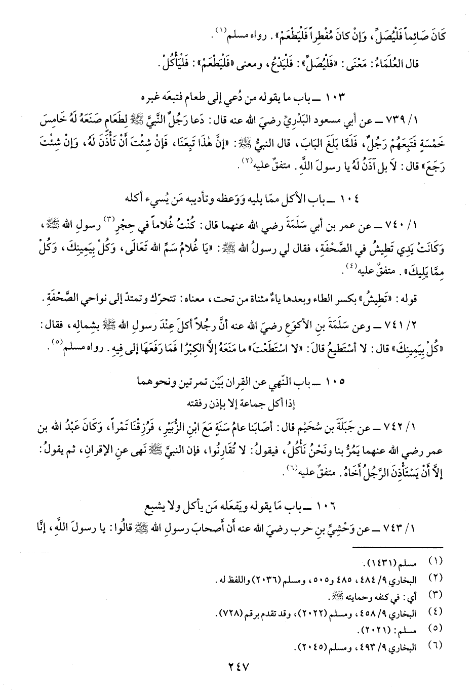1/740- عن عمر بن أَبي سَلَمَةَ رضي اللَّه عنهما قَالَ: كُنتُ غُلاماً في حِجْرِ رَسُول اللَّه صَلّى اللهُ عَلَيْهِ وسَلَّم، وكَانتْ يَدِي تَطِيشُ في الصَّحْفَةِ فَقَالَ لي رسولُ اللَّه صَلّى اللهُ عَلَيْهِ وسَلَّم: "يَا غُلامُ سَمِّ اللَّه تَعَالَى وَكُلْ بيمينِكَ وكلْ مِمَّا يَلِيكَ" متفقٌ عليه.