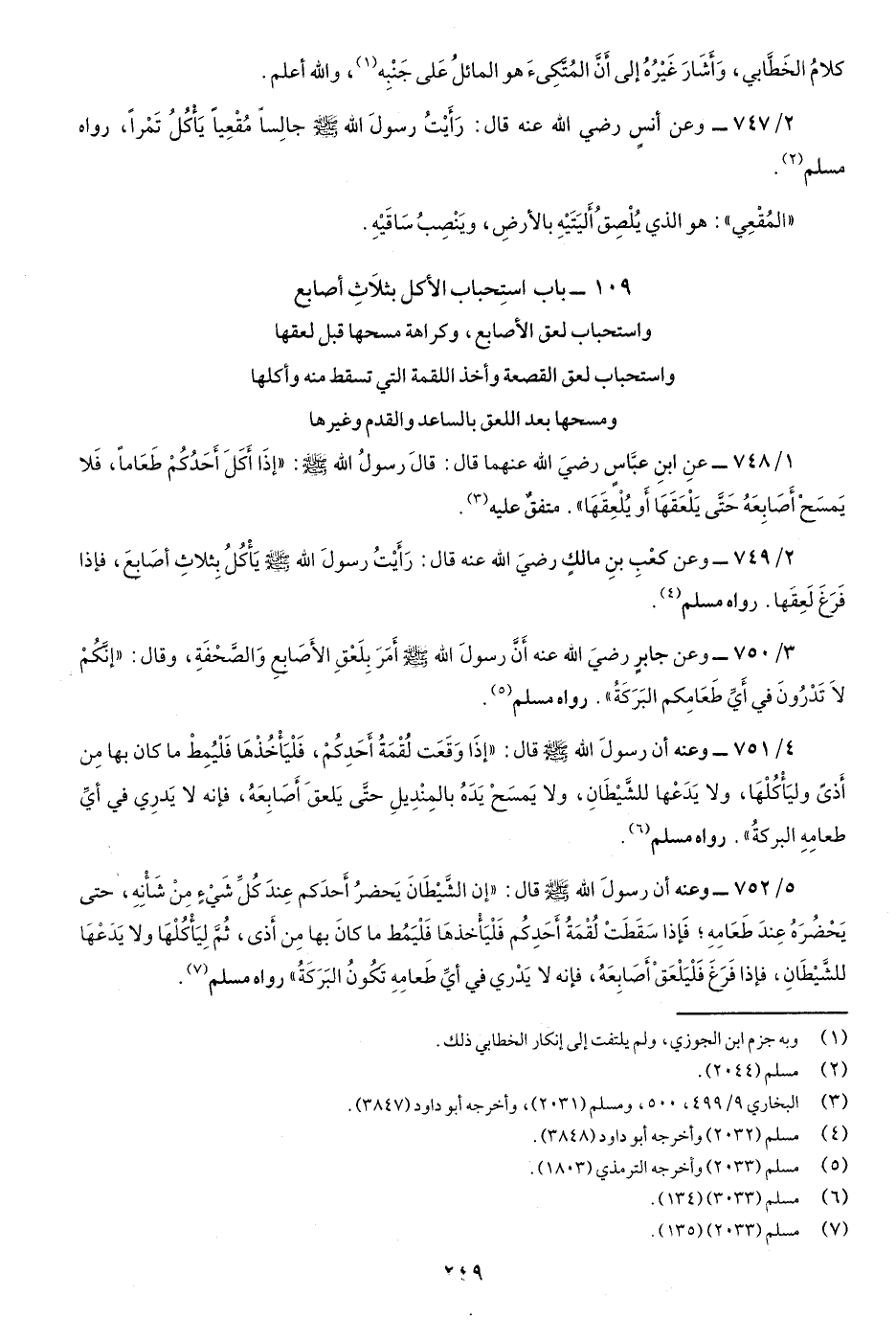 2/749- وعن كعْبِ بنِ مالك رضيَ اللَّه عنه قَالَ: رَأَيْتُ رسولَ اللَّه صَلّى اللهُ عَلَيْهِ وسَلَّم يَأْكُلُ بِثلاثِ أَصابِعَ فَإِذا فَرغَ لَعِقَها. رواه مسلم.