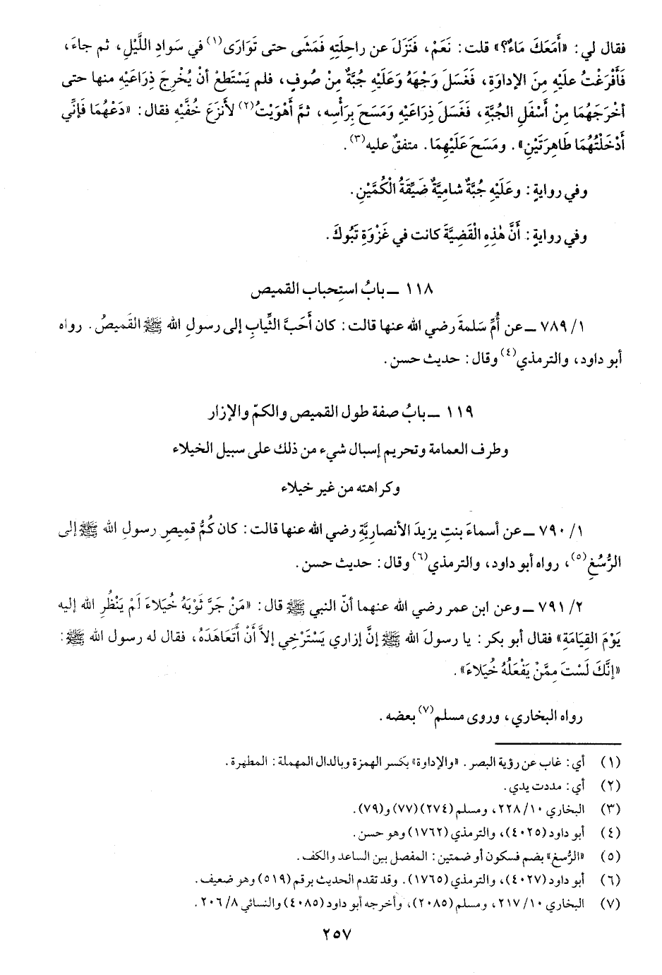 2/791- وعن ابن عمر رضي اللَّه عنهما أَنّ النَّبيّ صَلّى اللهُ عَلَيْهِ وسَلَّم قَالَ: "مَنْ جَرَّ ثَوْبَهُ خُيَلاءَ لَمْ يَنْظُر اللَّه إِليهِ يَوْم القِيَامَةِ"فَقَالَ أَبو بكر: يارسول اللَّه إِن إِزارى يَسْتَرْخى إِلا أَنْ أَتَعَاهَدَهُ، فَقَالَ لَهُ رَسُول اللَّه صَلّى اللهُ عَلَيْهِ وسَلَّم: "إِنَّكَ لَسْتَ مِمَّنْ يَفْعَلُهُ خُيَلاءَ". رواه البخاري، وروى مسلم بعضه.