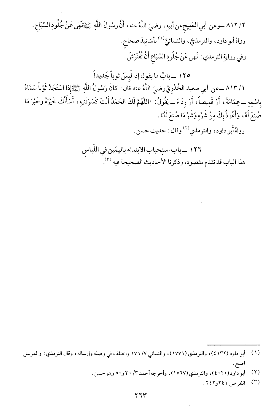 2/812- وعن أَبي المليح عن أَبيهِ، رضيَ اللَّه عنه، أنَّ رسُول اللَّهِ صَلّى اللهُ عَلَيْهِ وسَلَّم نَهَى عنْ جُلُودِ السِّباعِ.