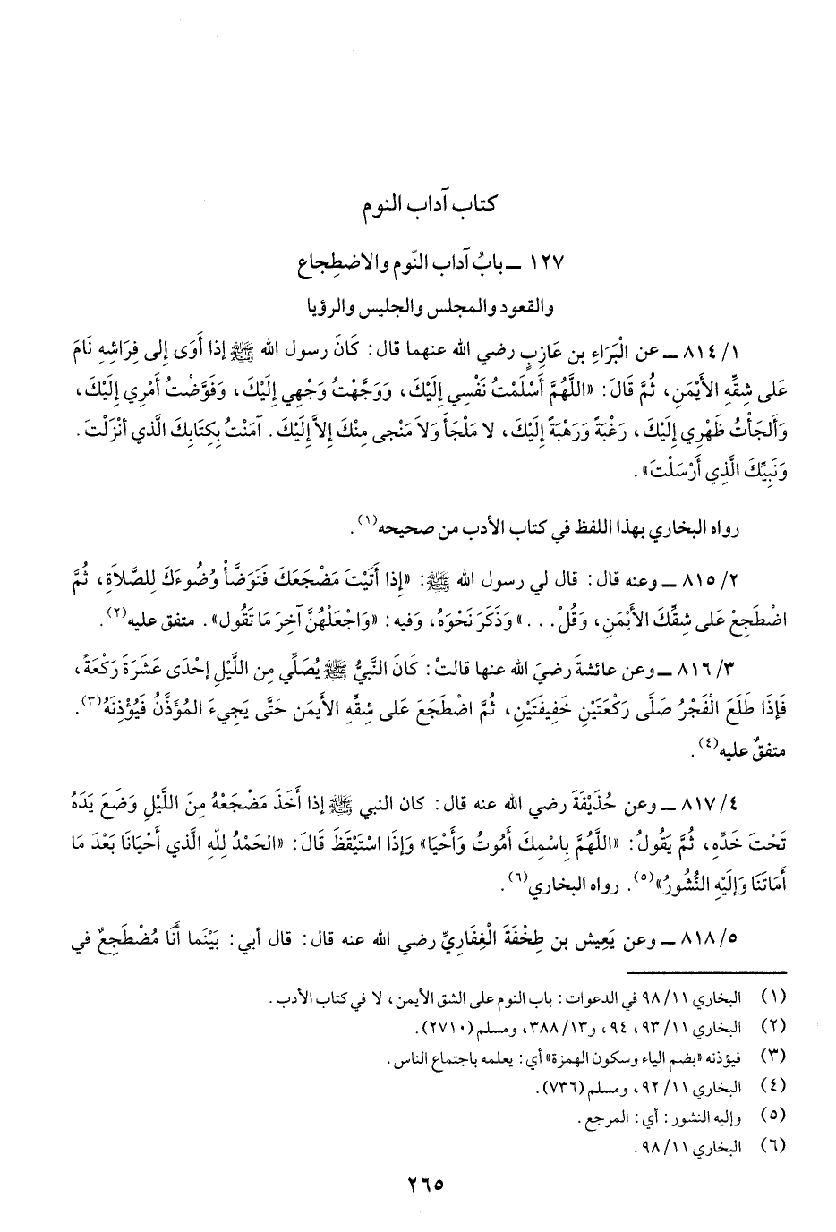 1/814- عن الْبَراءِ بن عازبٍ رضيَ اللَّه عنهما قَالَ: كَانَ رَسُولُ اللَّه صَلّى اللهُ عَلَيْهِ وسَلَّم إِذَا أَوَى إِلَى فِرَاشِهِ نَامَ عَلى شِقَّهِ الأَيمنِ، ثُمَّ قَالَ: "اللَّهُمَّ أَسْلَمْتُ نَفْسِي إليْكَ، وَوجَّهْتُ وَجْهي إلَيْكَ، وفَوَّضْتُ أَمْرِي إلَيْكَ، وَأَلجَأْتُ ظهْري إلَيْكَ، رَغْبةً وَرهْبَةً إلَيْكَ، لا مَلْجأ ولا مَنْجى مِنْكَ إلاَّ إلَيْكَ، آمَنْتُ بِكتَابكَ الَّذِي أَنْزلتَ، وَنَبيِّكَ الَّذِي أَرْسَلْتَ".