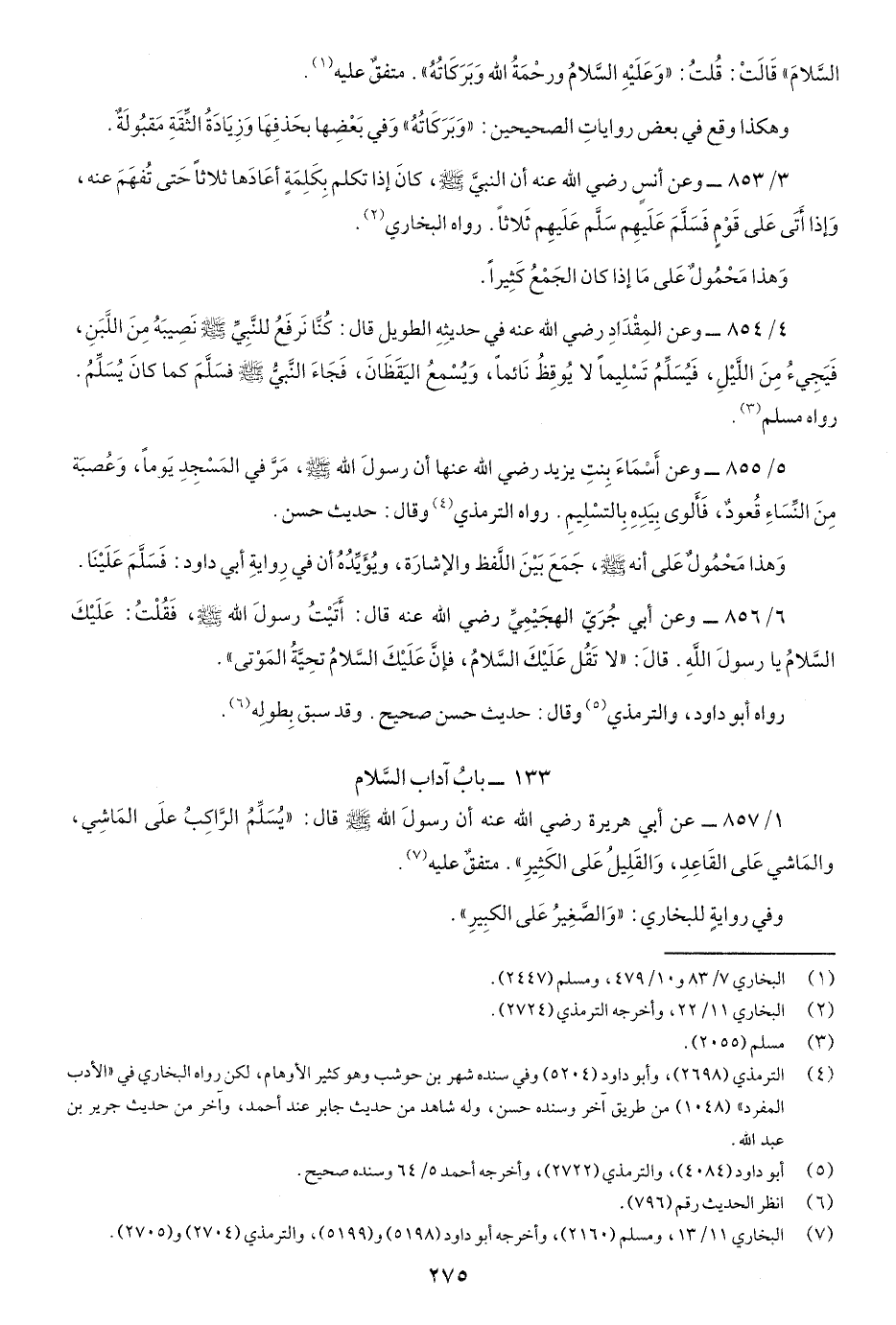 1/857- عن أَبي هريرة رضي الله عنه أنَّ رسولَ الله صَلّى اللهُ عَلَيْهِ وسَلَّم قَالَ: "يُسَلِّمُ الرَّاكبُ عَلَى الْمَاشِي، وَالْماشي عَلَي القَاعِدِ، والقليلُ عَلَى الكَثِيِرِ" متفقٌ عليه.