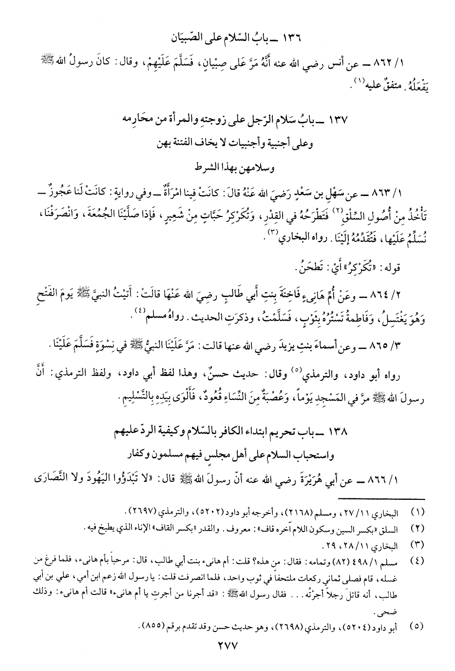 137- باب سلام الرجل على زوجته والمرأة من محارمه وعلى أجنبية وأجنبيات لا يخاف الفتنة بهن وسلامهن بهذا الشرط