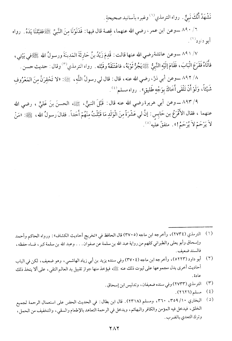 9/893- وعن أبي هُريرةَ رضي الله عنه قَالَ: قبَّل النَّبيُّ صَلّى اللهُ عَلَيْهِ وسَلَّم الحَسَنَ بْنَ عَليٍّ رضي الله عنهما، فَقَالَ، الأقْرَعُ بن حَابس: إنَّ لِي عَشَرةًَ مِنَ الْوَلَد ماَقَبَّلتُ مِنهُمْ أحَداَ. فَقَالَ رسول الله صَلّى اللهُ عَلَيْهِ وسَلَّم."مَنْ لاَيَرْحَمْ لا يُرْحَمْ، َ" متفق عليه.