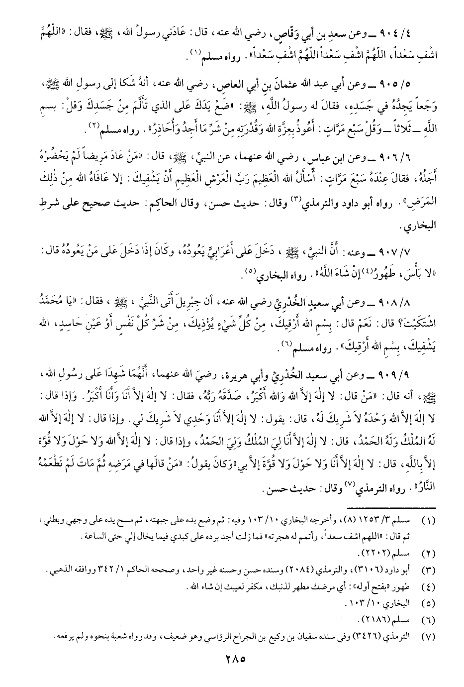 4/904- وعن سعدِ بن أَبي وَقَّاصٍ رضي اللَّه عنه قَالَ: عَادَني رسول اللَّه صَلّى اللهُ عَلَيْهِ وسَلَّم فَقَالَ: "اللَّهُمَّ اشْفِ سعْداً، اللَّهُمَّ اشْفِ سَعْداً، اللَّهُمْ اشْفِ سَعداً" رواه مسلم.