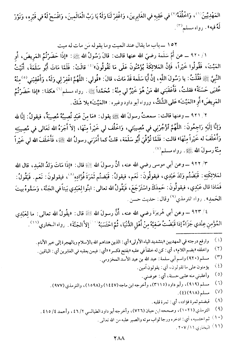 1/920- عن أُمِّ سلَمَةَ رضي اللَّه عنها قالت: قالَ رسُولُ اللَّهِ صَلّى اللهُ عَلَيْهِ وسَلَّم: "إِذا حَضرْتُمُ المرِيضَ، أَوِ المَيِّتَ، فَقُولُوا خيْراً، فَإِنَّ الملائِكَةَ يُؤمِّنونَ عَلى مَا تقُولُونَ" قالت: فلمَّا مَاتَ أَبُو سَلَمَة، أَتَيْتُ النَّبِيَّ صَلّى اللهُ عَلَيْهِ وسَلَّم فَقُلْتُ: يَا رسُولَ اللَّه، إِنَّ أَبَا سلَمَة قَدْ مَاتَ، قالَ: "قُولي: اللَّهُمَّ اغْفِرْ لِي وَلَهُ، وَأَعْقِبْني مِنْهُ عُقبى حَسَنَةً" فقلتُ: فأَعْقَبني اللَّهُ منْ هُوَ خَيْرٌ لِي مِنْهُ: مُحمَّداً صَلّى اللهُ عَلَيْهِ وسَلَّم. رواه مسلم هكَذا:"إِذا حَضَرْتُمُ المَرِيضَ" أَو"الميِّت"عَلَى الشَّكِّ، رواه أبو داود وغيره:"الميِّت"بلا شَكٍّ.