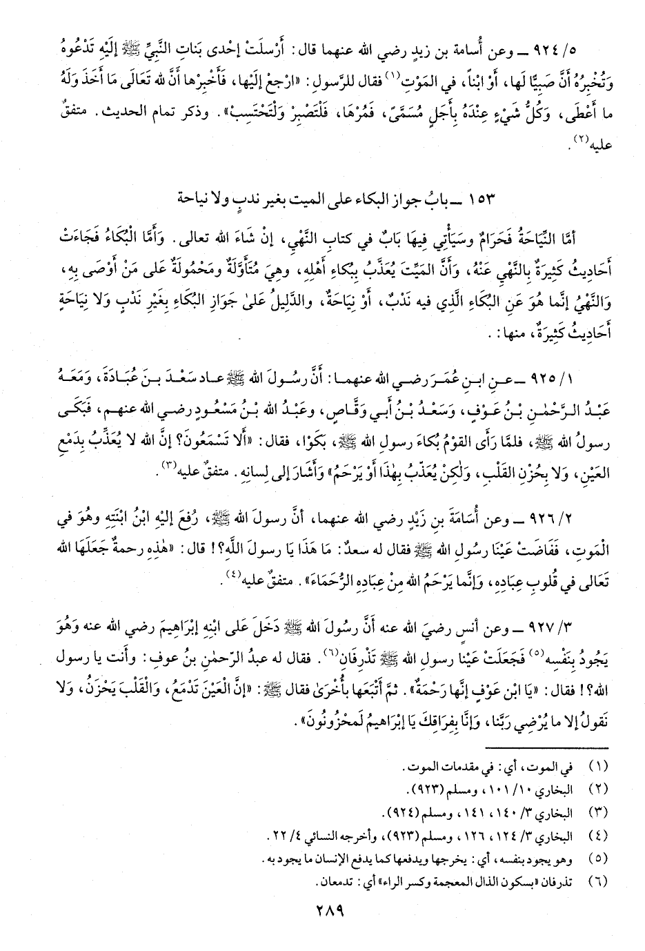 5/924- وعن أُسامةَ بنِ زيدٍ رضي اللَّه عنهما قَالَ: أَرْسَلَتْ إِحْدى بَناتِ النَّبيِّ صَلّى اللهُ عَلَيْهِ وسَلَّم إِلَيهِ تَدْعُوهُ وتُخْبِرُهُ أَنَّ صَبِيَّاً لهَا أَوْ ابْناً في المَوتِ فَقَالَ للرَّسول:"ارْجِعْ إِلَيْهَا، فَأَخْبِرْهَا أَنَّ للَّهِ تَعَالَى مَا أَخذَ ولَهُ مَا أعطَى، وَكُلُّ شَيْء عِنْدَهُ بِأَجْلٍ مُسَمَّى، فَمُرْهَا، فلْتَصْبِرْ ولْتَحْتسِبْ" وذكر تمام الحديث، متفقٌ عَلَيْهِ.