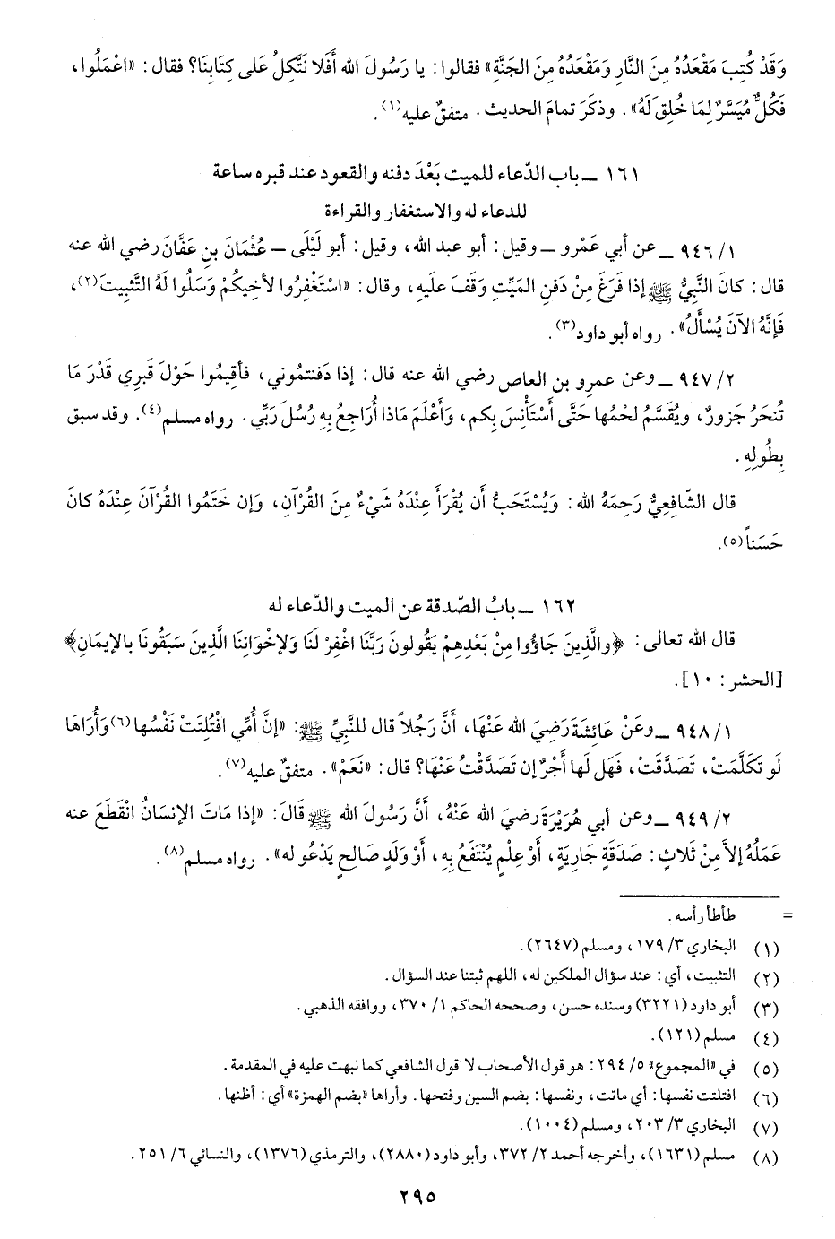 1/946- عن أَبي عَمْرو وقيل: أَبُو عبد اللَّه، وقيل: أَبو لَيْلى عُثْمَانُ بن عَفَّانَ رضي اللَّه عنه قَالَ: كانَ النَّبيُّ صَلّى اللهُ عَلَيْهِ وسَلَّم إِذَا فرَغَ مِن دَفْنِ المَيِّتِ وقَفَ علَيهِ، وقال: "استغفِرُوا لأخِيكُم وسَلُوا لَهُ التَّثبيتَ فإنَّهُ الآنَ يُسأَلُ ". رواه أَبُو داود.