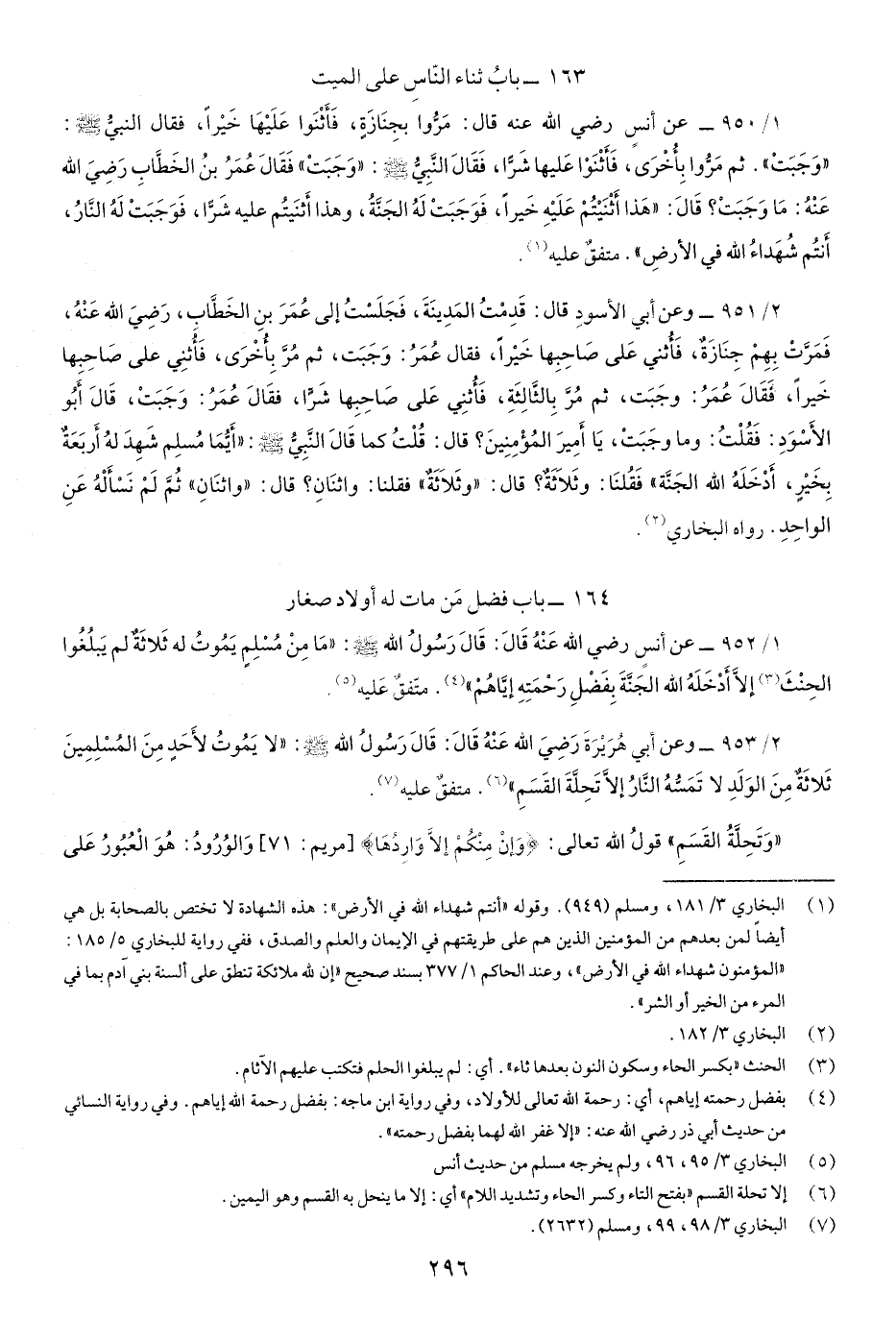 1/950- عن أَنسٍ رضي اللَّه عنه قَالَ: مرُّوا بجَنَازَةٍ، فَأَثنَوا عَلَيْهَا خَيراً فَقَالَ النبيُّ صَلّى اللهُ عَلَيْهِ وسَلَّم:"وَجَبَتْ"، ثُمَّ مرُّوا بِأُخْرَى، فَأَثنَوْا عَلَيْهَا شَرّاً، فَقَال النَِّبيُّ صَلّى اللهُ عَلَيْهِ وسَلَّم:"وَجبَتْ"فَقَال عُمرُ بنُ الخَطَّاب رَضِيَ اللَّه عَنْهُ: ما وجبَتْ؟ قَالَ:"هَذَا أَثنَيتُمْ علَيْهِ خَيراً، فَوَجبتْ لَهُ الجنَّةُ، وهَذَا أَثنَيتُم عَلَيْهِ شَرّاً، فَوَجبتْ لَهُ النًَّارُ، أنتُم شُهَداءُ اللَّهِ في الأرضِ". متفقٌ عَلَيْهِ.