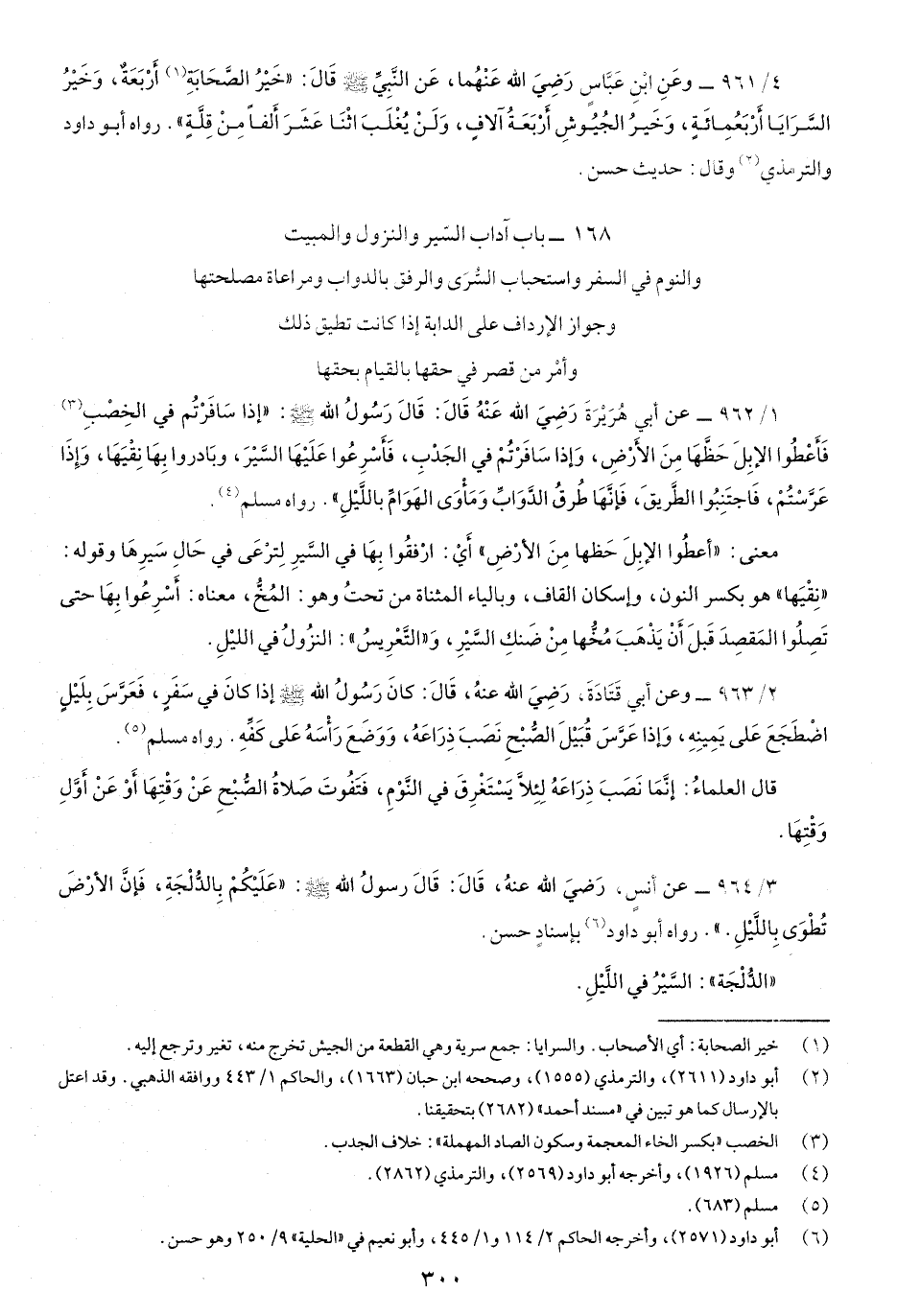 1/962- عن أَبي هُرَيْرَة رضِيَ اللَّهُ عَنْهُ قَالَ: قالَ رَسُولُ اللَّهِ صَلّى اللهُ عَلَيْهِ وسَلَّم: "إِذَا سافَرْتُم فِي الخِصْبِ فَأعْطُوا الإِبِلَ حظَّهَا مِنَ الأَرْضِ، وإِذا سافَرْتُمْ في الجَدْبِ، فَأَسْرِعُوا عَلَيْهَا السَّيْرَ وَبادروا بِهَا نِقْيَهَا، وَإذا عرَّسْتُم، فَاجتَنِبُوا الطَّريقَ، فَإِنَّهَا طرُقُ الدَّوابِّ، وَمأْوى الهَوامِّ باللَّيْلِ "رواه مسلم.