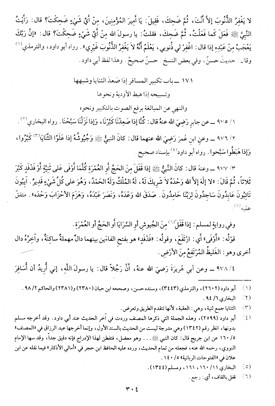 2/976- وعن ابن عُمر رضي اللَّه عنهما قال: كانَ النبيُّ صَلّى اللهُ عَلَيْهِ وسَلَّم وجيُوشُهُ إِذا علَوُا الثَّنَايَا كَبَّرُوا، وَإذا هَبطُوا سَبَّحوا. رواه أَبُو داود بإسناد صحيح.