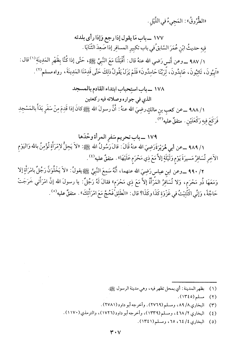1/989- عن أَبي هُرَيرَةَ رضي اللَّه عنهُ قَالَ: قَالَ رَسُولُ اللَّهِ صَلّى اللهُ عَلَيْهِ وسَلَّم: " لاَ يَحِلُّ لامْرَأَة تُؤْمِنُ باللَّهِ وَاليَومِ الآخِرِ تُسَافِرُ مَسِيرَةَ يَوْمٍ وَلَيْلَةٍ إلاَّ مَعَ ذِي محْرمٍ عليْهَا" متفقٌ عَلَيْهِ.