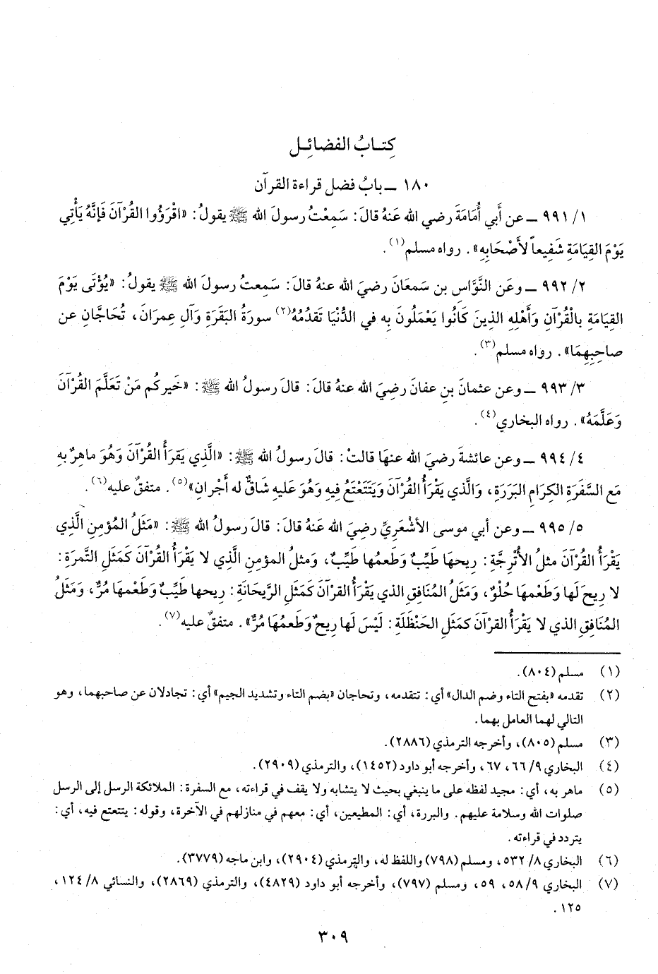 1/991- عن أَبي أُمامَةَ رضي اللَّه عنهُ قَالَ: سمِعتُ رسولَ اللَّهِ صَلّى اللهُ عَلَيْهِ وسَلَّم يقولُ: "اقْرَؤُا القُرْآنَ فإِنَّهُ يَأْتي يَوْم القيامةِ شَفِيعاً لأصْحابِهِ" رواه مسلم.