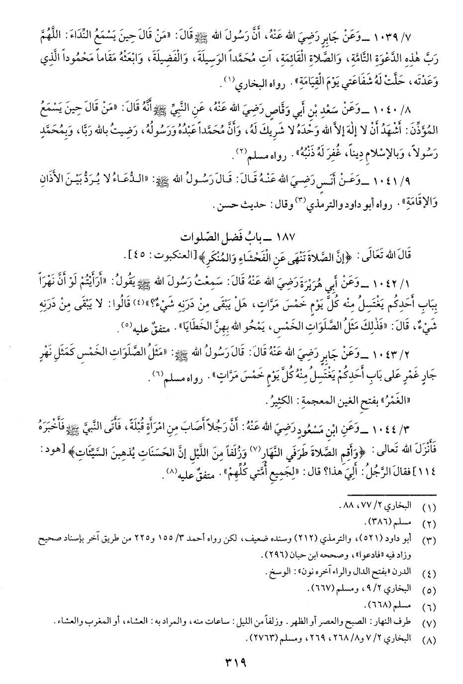 7/1039- وَعنْ جابرٍ رضَي اللَّه عنْهُ أَنَّ رَسُولَ اللَّهِ صَلّى اللهُ عَلَيْهِ وسَلَّم قَالَ: "مَنْ قَال حِين يسْمعُ النِّداءَ: اللَّهُمَّ رَبَّ هذِهِ الدَّعوةِ التَّامَّةِ، والصَّلاةِ الْقَائِمةِ، آتِ مُحَمَّداً الْوسِيلَةَ، والْفَضَيِلَة، وابْعثْهُ مقَامًا محْمُوداً الَّذي وعَدْتَه، حلَّتْ لَهُ شَفَاعتي يوْم الْقِيامِة" رواه البخاري.