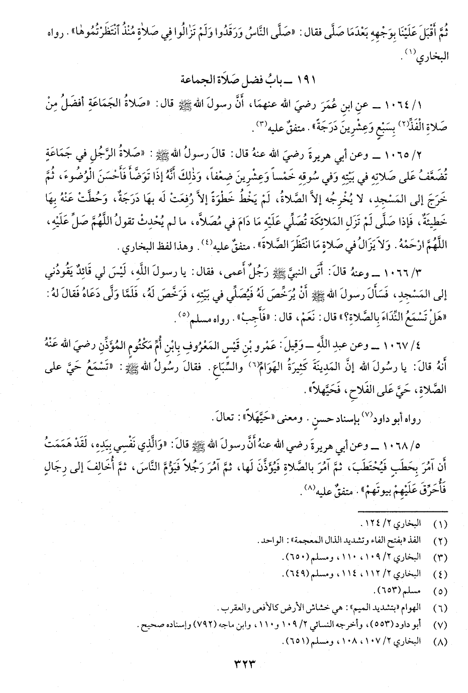1/1064- عن ابنِ عمَر رضي اللَّه عنهما أَنَّ رسولَ اللَّه صَلّى اللهُ عَلَيْهِ وسَلَّم قَالَ: "صَلاةُ الجَمَاعَةِ أَفضَلُ مِنْ صَلاةِ الفَذِّ بِسَبْعٍ وَعِشْرِينَ درَجَةً" متفقٌ عليه.
