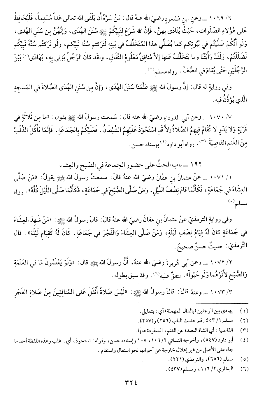 6/1069- وعن ابنِ مسعودٍ رضي اللَّه عنهُ قال: مَنْ سَرَّه أَن يَلْقَي اللَّه تَعَالَى غداً مُسْلِمًا فَلْيُحَافِظْ عَلى هَؤُلاءِ الصَّلَوات حَيْثُ يُنادَى بهنَّ، فَإِنَّ اللَّهَ شَرَعَ لِنَبِيِّكم صَلّى اللهُ عَلَيْهِ وسَلَّم سُنَنَ الهُدَى وَإِنَّهُنَّ مِن سُنَنِ الهُدى، وَلَو أَنَّكُمْ صلَّيْتم في بُيوتِكم كَمَا يُصَلِّي هذا المُتَخَلِّف فِي بَيتِهِ لَتَركتم سُنَّة نَبِيِّكم، ولَو تَركتم سُنَّةَ نَبِيِّكم لَضَلَلْتُم، ولَقَد رَأَيْتُنَا وَمَا يَتَخَلَّف عَنها إِلاَّ مُنَافِقٌ مَعْلُومُ النِّفَاق، وَلَقَدَ كانَ الرَّجُل يُؤتىَ بِهِ، يُهَادَي بيْنَ الرَّجُلَيْنِ حَتَّى يُقَامَ في الصَّفِّ. رَوَاهُ مُسلِم.