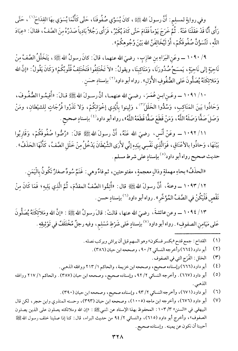 11/1092- وعَنْ أَنسٍ رضيَ اللَّه عَنْهُ أَنَّ رسولَ اللَّهِ صَلّى اللهُ عَلَيْهِ وسَلَّم قَالَ: "رُصُّوا صُفُوفَكُمْ، وَقَاربُوا بَيْنَها، وحاذُوا بالأَعْناق، فَوَالَّذِي نَفْسِي بيَدِهِ إِنَّي لأَرَى الشَّيْطَانَ يَدْخُلُ منْ خَلَلِ الصَّفِّ، كأنَّها الحَذَفُ "حديث صحيح رَوَاهُ أبُو دَاوُدَ بإِسناد عَلَى شرط مسلم.