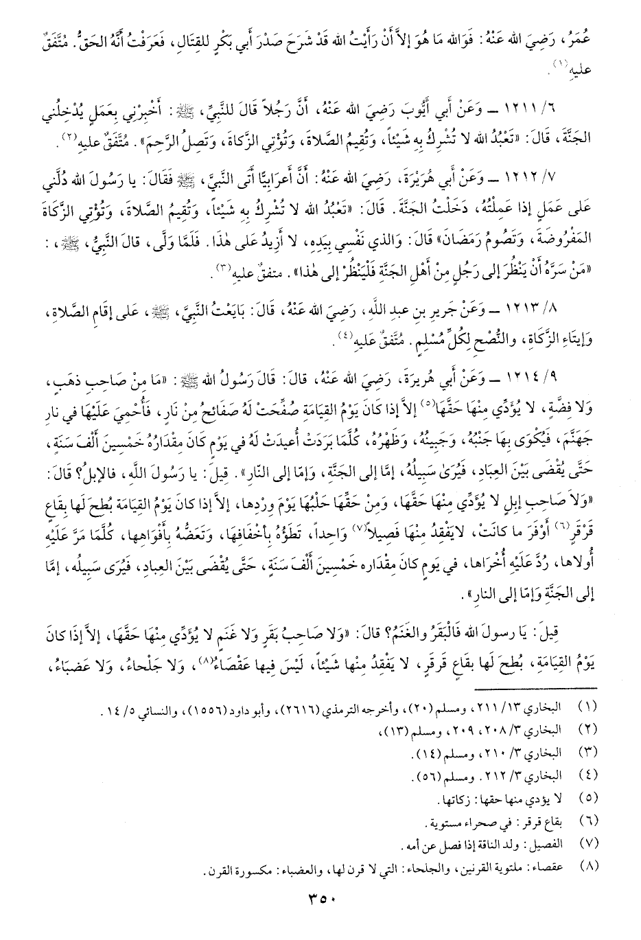 9/1214- وَعَنْ أَبي هُريرةَ رضيَ اللَّه عنْهُ قَالَ: قَالَ رسولُ اللَّهِ صَلّى اللهُ عَلَيْهِ وسَلَّم: "مَا مِنْ صاحِبِ ذهَبٍ، وَلا فِضَّةٍ، لا يُؤَدِّي مِنْهَا حَقَّهَا إِلاَّ إِذَا كَانَ يَوْمُ القِيامَةِ صُفِّحَتْ لَهُ صَفائِحُ مِنْ نَارِ، فَأُحْمِيَ عَلَيْهَا في نَارِ جَهَنَّمَ، فَيُكْوَى بهَا جنبُهُ، وجبِينُهُ، وظَهْرُهُ، كُلَّما برَدتْ أُعيدتْ لَهُ في يوْمٍ كَانَ مِقْدَارُه خمْسِينَ أَلْف سنَةٍ، حتَّى يُقْضَى بيْنَ العِبادِ فَيُرَى سبِيلُهُ، إِمَّا إِلى الجنَّةِ وإِما إِلى النَّارِ".قيل: يَا رسُولَ اللَّهِ فالإِبِلُ؟ قالَ: "وَلاَ صاحبِ إِبِلٍ لا يؤَدِّي مِنهَا حقَّهَا، ومِنْ حقِّهَا، حَلْبُهَا يومَ وِرْدِها، إِلا إِذَا كَانَ يَومُ القيامَة بُطِحَ لَهَا بِقَاعٍ قَرْقَرٍ أَوْفر مَا كانتْ، لاَ يَفقِدُ مِنْهَا فَصِيلاً واحِداً، تَطؤُهُ بأَخْفَافِها، وتَعَضُّهُ بِأَفْواهِها، كُلَّما مَرَّ عليْهِ أَولاها، ردَّ عليْهِ أُخْراها، في يومٍ كانَ مِقْداره خَمْسِينَ أَلْفَ سَنةٍ، حتَّى يُقْضَي بَيْنَ العِبَاد، فَيُرَى سبِيلُه، إِمَّا إِلى الجنَّةِ وإِمَّا إِلى النارِ". قِيل: يَا رَسولَ اللَّهِ فَالْبقرُ وَالغَنَمُ؟ قالَ: "وَلاَ صاحِبِ بقرٍ وَلاَ غَنمٍ لاَ يُؤَدِّي مِنْهَا حقَّهَا إِلاَّ إِذا كَانَ يَوْمُ القيامَةِ، بُطِحَ لهَا بقَاعٍ قَرقَرٍ، لاَ يفْقِد مِنْهَا شَيْئاً لَيْس فِيها عَقْصاءُ، وَلا جَلْحاءُ، وَلا عَضباءُ،