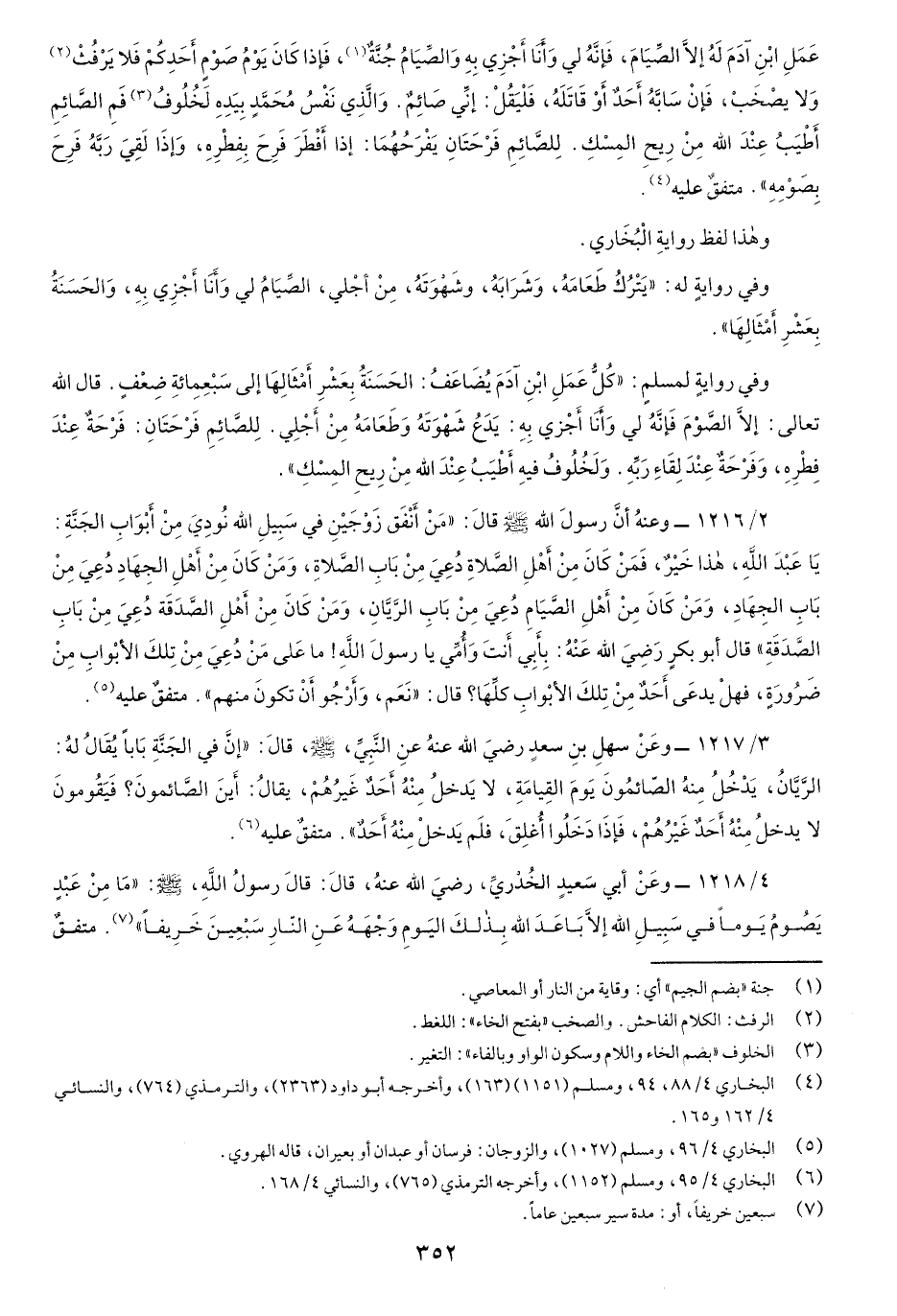 4/1218- وعَنْ أَبي سَعيدٍ الخُدْريِّ رَضيَ اللَّه عنهُ قال: قالَ رسولُ اللَّهِ: "مَا مِنْ عبْدٍ يصُومُ يَوماً في سبِيلِ اللَّه إِلاَّ باعَدَ اللَّه بِذلك اليَومِ وجهَهُ عَن النَّارِ سبعينَ خرِيفاً" متفقٌ