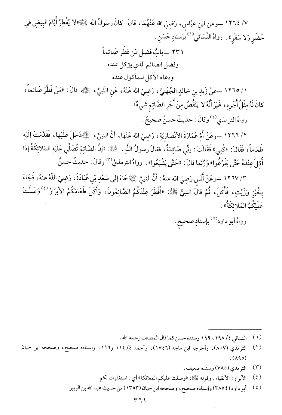 2/1266- وعَنْ أُمِّ عمَارَةَ الأَنْصارِيَّةِ رَضِيَ اللَّه عَنْها، أَنَّ النبيَّ صَلّى اللهُ عَلَيْهِ وسَلَّم دخَلَ عَلَيْها، فقدَّمَتْ إِلَيْهِ طَعَاماً، فَقالَ: "كُلِي"فَقالَت: إِنِّي صائمةٌ، فقالَ رسولُ اللَّهِ صَلّى اللهُ عَلَيْهِ وسَلَّم:"إِنَّ الصَّائمَ تُصلِّي عَلَيْهِ المَلائِكَةُ إِذا أُكِلَ عِنْدَهُ حتَّى يَفْرَغُوا" وَرُبَّما قَالَ:"حَتَّى يَشْبَعُوا "رواهُ الترمذيُّ وقال: حديثٌ حسنٌ.