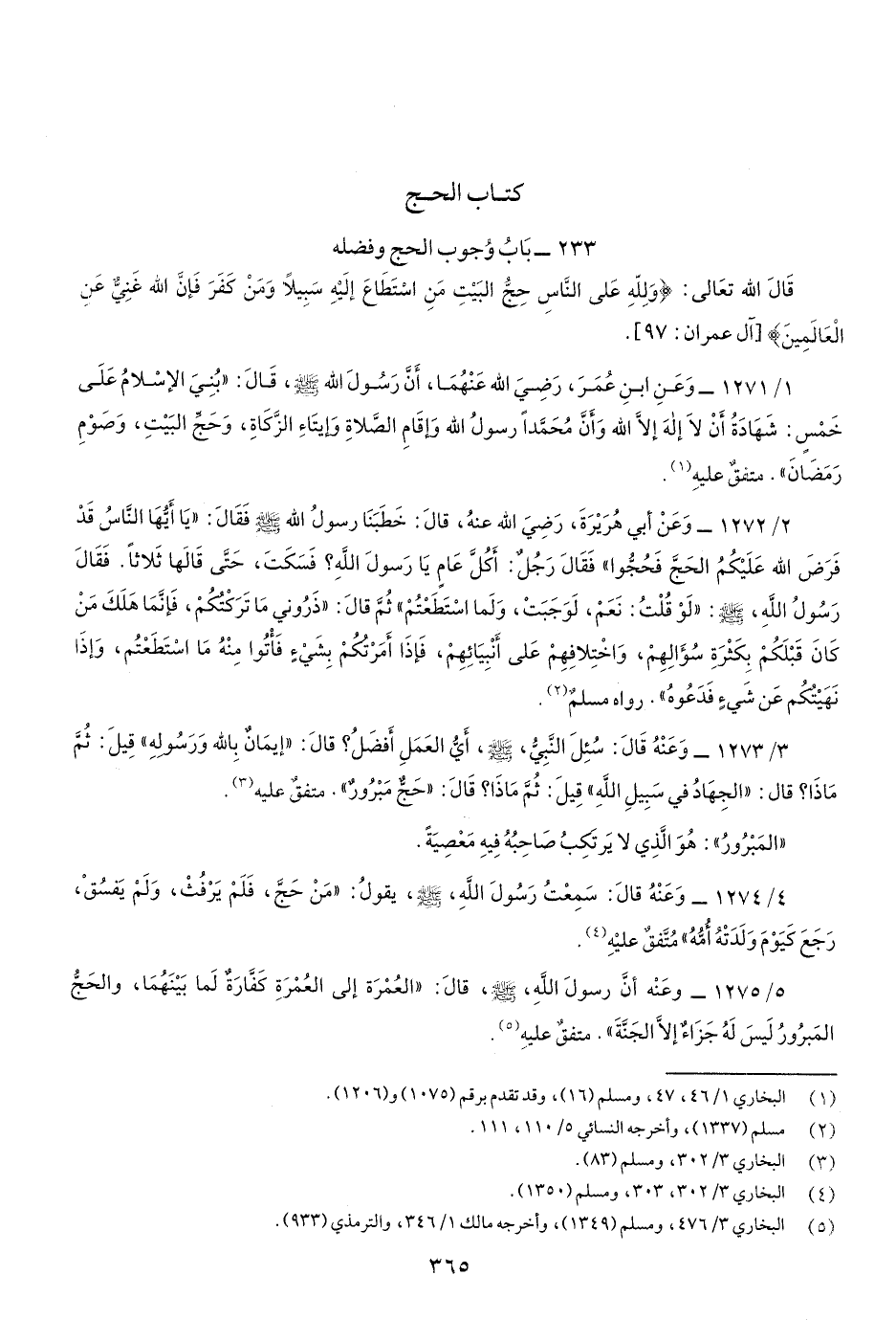 1/1271- وَعَنِ ابن عُمرَ، رضي اللَّه عَنْهُمَا، أنَّ رَسُولَ اللَّهِ صَلّى اللهُ عَلَيْهِ وسَلَّم، قَال: "بُنِيَ الإسْلامُ عَلَى خَمْسٍ: شَهادَةِ أَنْ لاَ إلهَ إلاَّ اللَّه وأَنَّ مُحَمَّداً رسولُ اللَّهِ، وإقَامِ الصَّلاةِ وإِيتَاءِ الزَّكَاةِ، وحَجِّ البيْتِ، وصَوْمِ رَمَضَانَ" متفقٌ عليهِ.