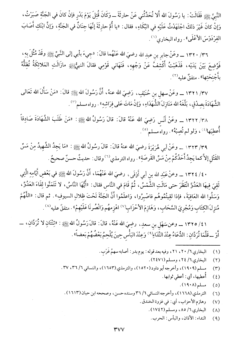 النبي صَلّى اللهُ عَلَيْهِ وسَلَّم فَقَالَت: يَا رَسُولَ اللَّهِ ألاَ تُحدِّثُني عَنْ حارِثَةَ، وَكانَ قُتِل يوْمَ بدْرٍ، فَإنْ كانَ في الجَنَّةِ صَبَرتُ، وَإن كانَ غَيْر ذلكَ اجْتَهَدْتُ عليْهِ في البُكَاءِ، فَقَالَ:"يَا أُم حارِثَةَ إنَّهَا جِنانٌ في الجَنَّةِ، وَإنَّ ابْنَكِ أَصاب الفرْدوْسَ الأَعْلى". رواه البخاري.
