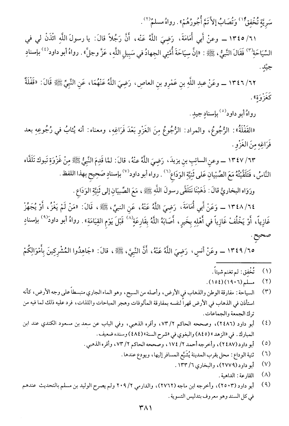 61/1345- وعنْ أَبي أُمامَةَ، رضي اللَّه عنْهُ، أنَّ رَجُلاً قالَ: يَا رسولَ اللَّه ائذَن لي في السِّياحةِ. فَقالَ النبيُّ صَلّى اللهُ عَلَيْهِ وسَلَّم:"إنَّ سِياحةَ أُمَّتي الجِهادُ في سبيلِ اللَّهِ، عَزَّ وجلَّ "رواهُ أَبُو داود بإسنادٍ جيِّد.