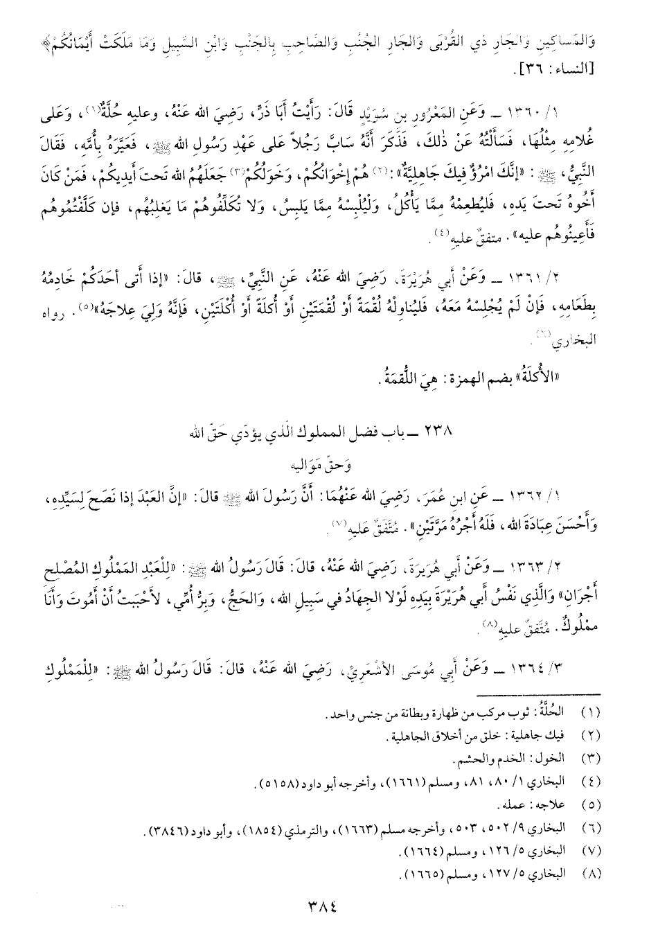 1/1360- وعنِ المَعْرُور بن سُويْدٍ قالَ: رأَيْتُ أَبَا ذَرٍّ، رضِيَ اللَّه عَنْهُ، وعليهِ حُلَّةٌ، وعَلى غُلامِهِ مِثْلُهَا، فَسَألْتُهُ عَنْ ذَلِكَ، فَذكر أنَّه سَابَّ رَجُلاً عَلَى عهْدِ رَسُولِ اللَّه صَلّى اللهُ عَلَيْهِ وسَلَّم، فَعَيَّرَهُ بأُمِّهِ، فَقَال النبيُّ صَلّى اللهُ عَلَيْهِ وسَلَّم: "إنَّك امْرُؤٌ فِيك جاهِليَّةٌ": هُمْ إخْوانُكُمْ، وخَولُكُمْ، جعَلَهُمُ اللَّه تَحت أيدِيكُمْ، فَمَنْ كَانَ أَخُوهُ تَحت يَدهِ فليُطعِمهُ مِمَّا يَأْكلُ، وَلْيُلْبِسْهُ مِمَّا يلبَسُ، وَلاَ تُكَلِّفُوهُم مَا يَغْلبُهُمْ، فَإنْ كَلَّفتُمُوهُم فَأَعِينُوهُم "،متفقٌ عَلَيْهِ.