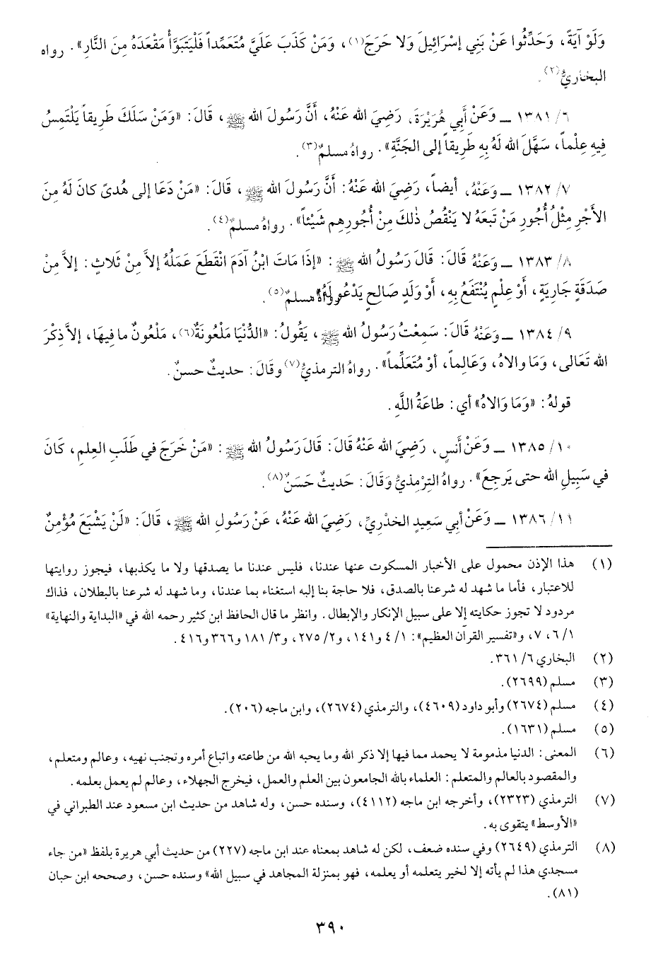 6/1381- وعنْ أَبي هُريرةَ، رضي اللَّه عَنْهُ، أنَّ رسُول اللَّه صَلّى اللهُ عَلَيْهِ وسَلَّم، قالَ: "ومَنْ سلَك طرِيقاً يَلْتَمِسُ فِيهِ عِلْماً، سهَّلَ اللَّه لَهُ بِهِ طَرِيقاً إِلَى الجَنَّةِ "رواهُ مسلمٌ.