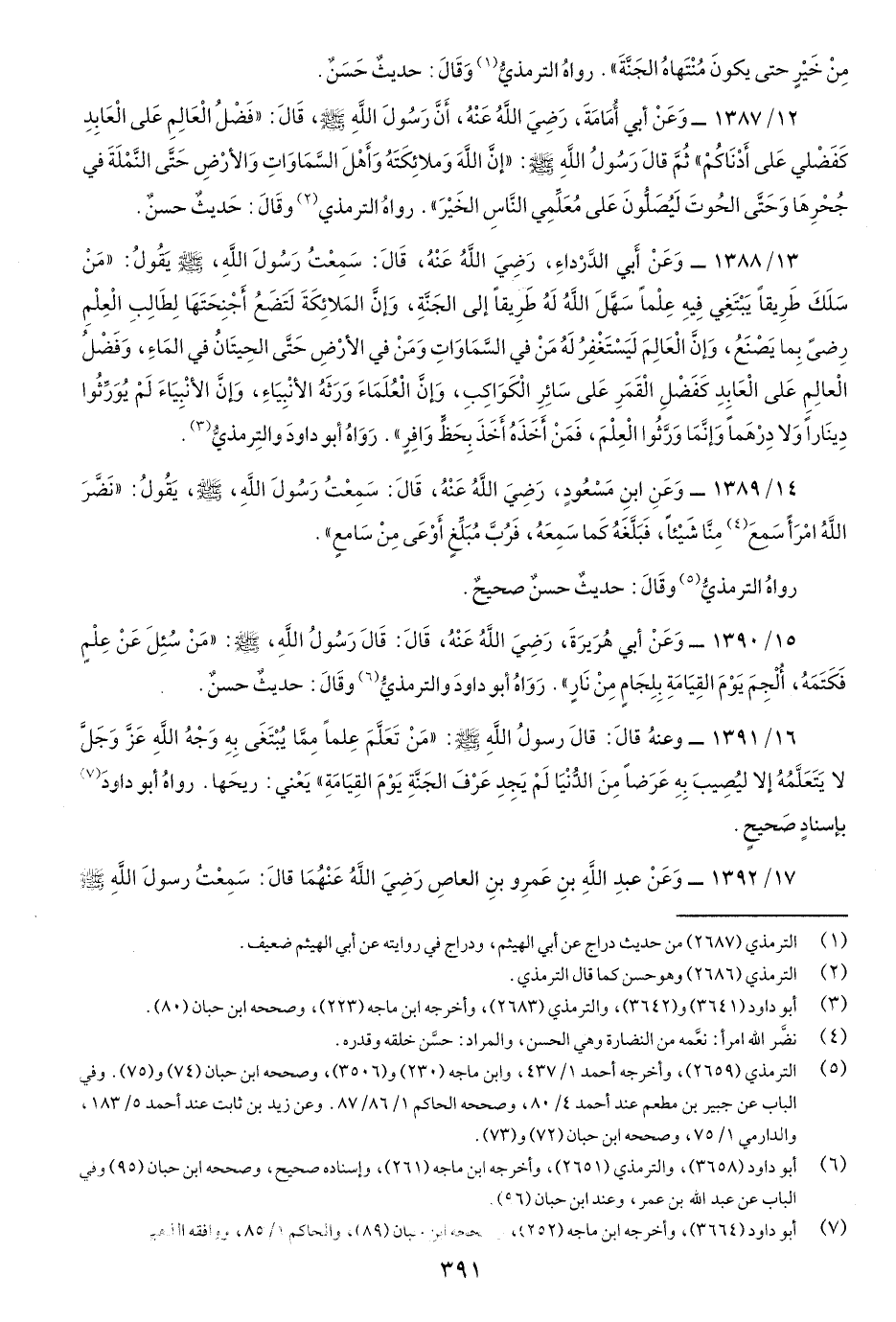 12/1387- وعَنْ أَبي أُمَامة، رضي اللَّه عنْهُ، أنَّ رَسُول اللَّه صَلّى اللهُ عَلَيْهِ وسَلَّم قَالَ: "فضْلُ الْعالِم عَلَى الْعابِدِ كَفَضْلي عَلَى أَدْنَاكُمْ"ثُمَّ قَالَ: رسُولُ اللَّهِ صَلّى اللهُ عَلَيْهِ وسَلَّم:"إنَّ اللَّه وملائِكَتَهُ وأَهْلَ السَّمواتِ والأرضِ حتَّى النَّمْلَةَ في جُحْرِهَا وَحَتَّى الحُوتَ لَيُصَلُّونَ عَلى مُعلِّمِي النَّاسِ الخَيْرْ "رواهُ الترمذي وقالَ: حَديثٌ حَسنٌ.