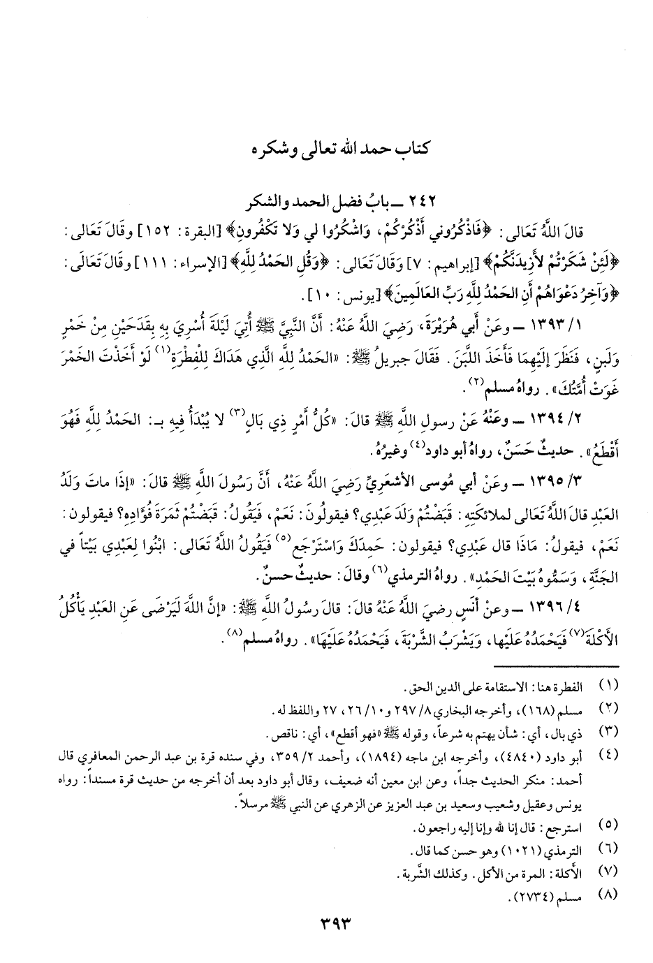 قَالَ الله تَعَالَى: {فَاذْكُرُونِي أَذْكُرْكُمْ وَاشْكُرُوا لِي وَلا تَكْفُرُونِ} [البقرة: 152] وقال تَعَالَى: {لَئِنْ شَكَرْتُمْ لأَزِيدَنَّكُمْ} [إبراهيم: 7] وقال تَعَالَى: {وَقُلِ الْحَمْدُ لِلَّهِ} [الإسراء: 111] وقال تَعَالَى: {وَآخِرُ دَعْوَاهُمْ أَنِ الْحَمْدُ لِلَّهِ رَبِّ الْعَالَمِينَ} [يونس: 10] .