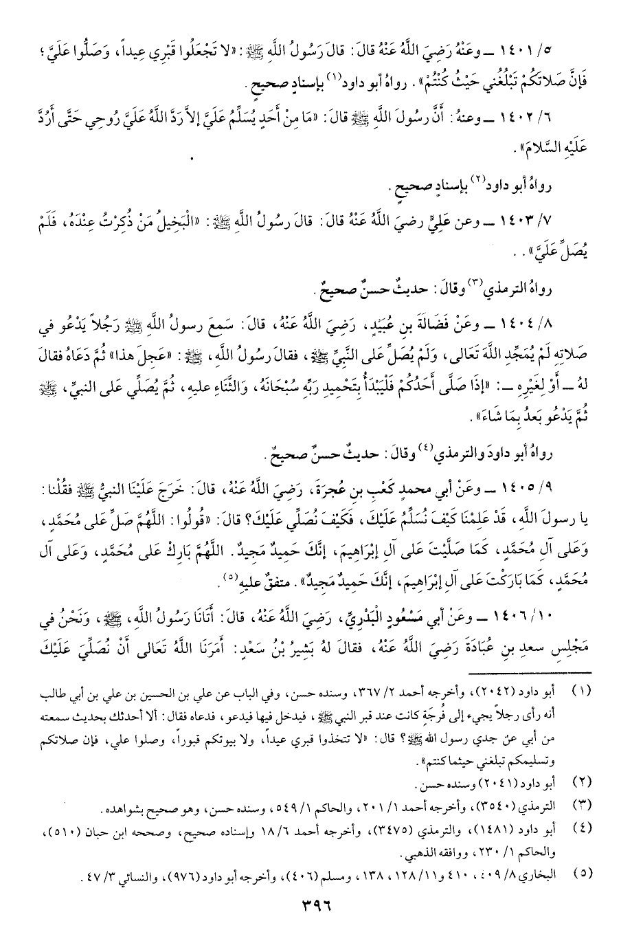 5/1401- وعنهُ رضي اللَّه عنْهُ قَالَ: قالَ رَسُولُ اللَّه صَلّى اللهُ عَلَيْهِ وسَلَّم: "لا تَجْعلُوا قَبْرِي عِيداً، وَصلُّوا عَلَيَّ، فَإنَّ صَلاتَكُمْ تَبْلُغُني حيْثُ كُنْتُمْ" رواهُ أَبُو داود بإسنادٍ صحيح.