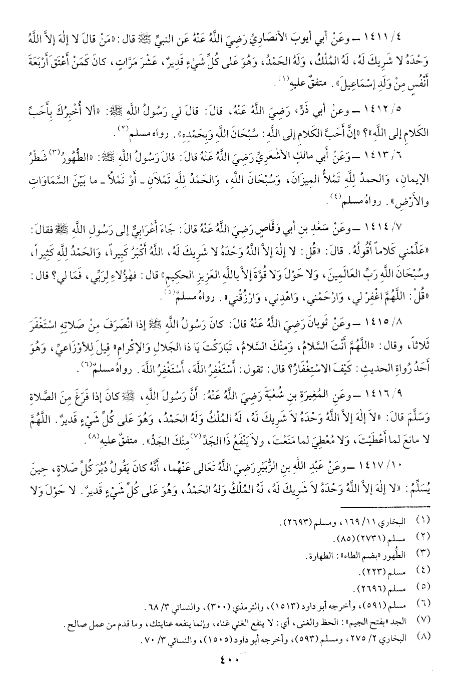 4/1411- وعَنْ أَبي أيوبَ الأنصَاريِّ رضي اللَّه عَنْهُ عَن النَّبيّ صَلّى اللهُ عَلَيْهِ وسَلَّم قَالَ: "مَنْ قالَ لا إلهَ إلاَّ اللَّه وحْدهُ لاَ شَرِيكَ لهُ، لَهُ المُلْكُ، ولَهُ الحمْدُ، وَهُو عَلَى كُلِّ شَيءٍ قَدِيرٌ، عشْر مرَّاتٍ: كَانَ كَمَنْ أَعْتَقَ أرْبعةَ أَنفُسٍ مِن وَلِد إسْماعِيلَ" متفقٌ عليهِ.