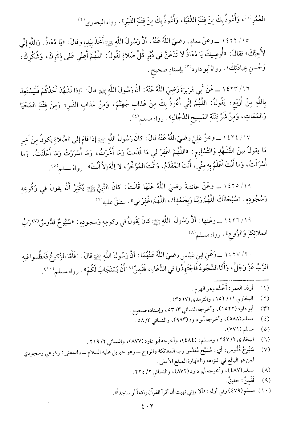 16/1423- عنْ أبي هُريْرة رضي اللَّه عَنْهُ أنَّ رسُولَ اللَّهِ صَلّى اللهُ عَلَيْهِ وسَلَّم قَالَ: "إِذَا تَشَهَّد أَحدُكُمْ فَليسْتَعِذ بِاللَّه مِنْ أرْبَع، يقولُ: اللَّهُمَّ إنِّي أعُوذُ بِكَ مِنْ عذَابِ جهَنَّمَ، وَمِنْ عَذَابِ القَبرِ، وَمِنْ فِتْنةِ المحْيَا والمَماتِ، وَمِنْ شَرِّ فِتْنَةِ المَسِيح الدَّجَّالِ". رواه مسلم.