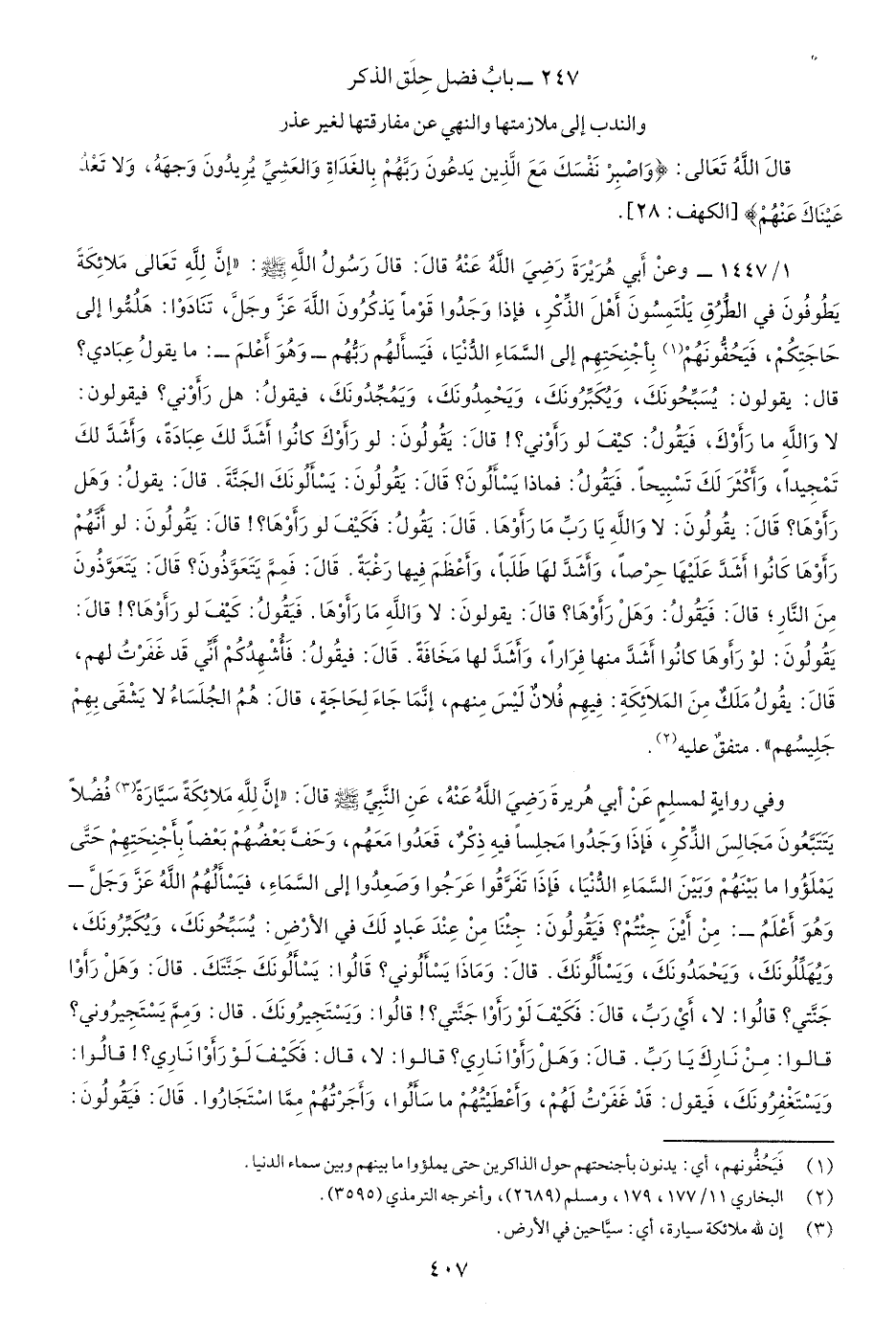 1/1447- وعنْ أَبي هُريرةَ رضي اللَّه عنهُ قَالَ: قالَ رَسُولُ اللَّهِ صَلّى اللهُ عَلَيْهِ وسَلَّم: "إِنَّ للَّهِ تَعالى ملائِكَةً يَطُوفُونَ في الطُّرُق يَلْتَمِسُونَ أَهْلَ الذِّكْرِ، فإِذا وَجدُوا قَوْماً يذكُرُونَ اللَّه عَزَّ وَجلَّ، تَنَادَوْا: هَلُمُّوا إِلى حاجتِكُمْ، فَيَحُفُّونَهم بِأَجْنِحَتِهم إِلى السَّمَاء الدُّنْيَا، فَيَسأَلهُم رَبُّهُم - وَهُوَ أَعْلم-: مَا يقولُ عِبَادِي؟ قَالَ: يَقُولُونَ: يُسبِّحُونَكَ وَيُكَبِّرونَكَ، ويحْمَدُونَكَ، ويُمَجِّدُونَكَ، فيقولُ: هَلْ رأَوْني؟ فيقولونَ: لا واللَّهِ مَا رأَوْكَ، فَيَقُولُ: كَيْفَ لَوْ رَأَوْني؟، قَالَ: يقُولُون لَوْ رَأَوْكَ كانُوا أَشَدَّ لكَ عِبادَةً، وأَشَدَّ لكَ تمْجِيداً، وأَكثرَ لكَ تَسْبِيحاً. فَيَقُولُ: فماذا يَسأَلُونَ؟ قَالَ: يَقُولونَ: يسأَلُونَكَ الجنَّةَ. قالَ: يقولُ: وَهل رَأَوْهَا؟ قالَ: يَقُولُونَ: لا وَاللَّه ياربِّ مَا رأَوْهَا. قَالَ: يَقُولُ: فَكَيْفَ لَوْ رَأَوْهَا؟، قَالَ: يَقُولُونَ: لَوْ أَنَّهُم رأَوْها كَانُوا أَشَدَّ علَيْهَا حِرْصاً، وَأَشَدَّ لهَا طَلَباً، وَأَعْظَم فِيها رغْبة. قَالَ: فَمِمَّ يَتَعَوَّذُونَ؟ قَالَ: يَتعَوَّذُونَ مِنَ النَّارِ، قَالَ: فَيقُولُ: وهَل رَأَوْهَا؟ قالَ: يقولونَ: لا واللَّهِ مَا رأَوْهَا. فَيقُولُ: كَيْف لَوْ رَأوْها؟، قَالَ: يقُولُون: لَوْ رَأَوْهَا كانوا أَشَدَّ مِنْهَا فِراراً، وأَشَدَّ لَهَا مَخَافَة. قَالَ: فيقُولُ: فَأُشْهدُكم أَنِّي قَد غَفَرْتُ لَهُم، قَالَ: يقُولُ مَلَكٌ مِنَ الملائِكَةِ: فِيهم فُلانٌ لَيْس مِنهم، إِنَّمَا جاءَ لِحاجَةٍ، قَالَ: هُمُ الجُلَسَاءُ لا يَشْقَى بِهم جلِيسهُم "متفقٌ عَلَيْهِ.
