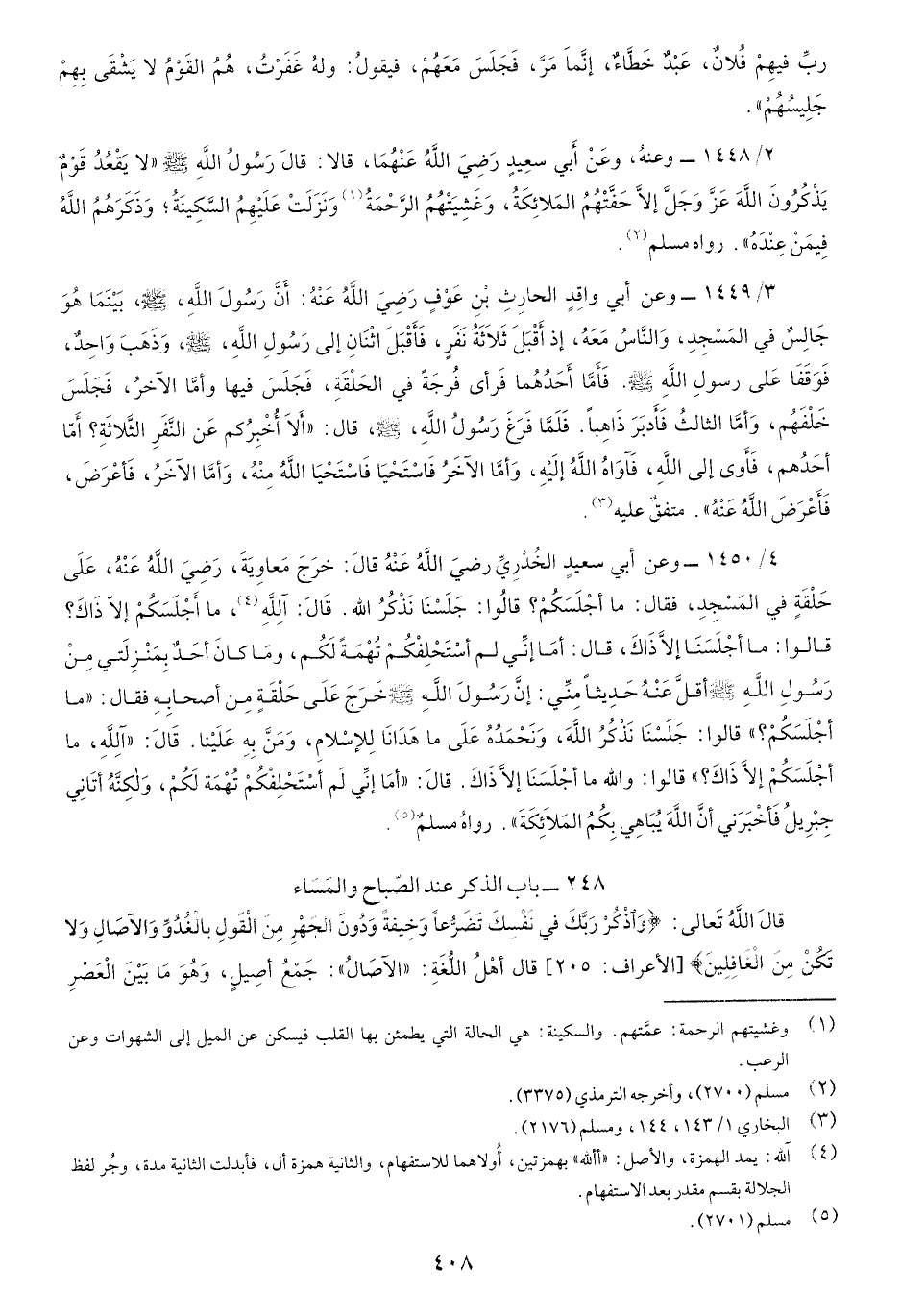 4/1450-وعن أَبي سعيد الخُدْريِّ رضي اللَّه عنْهُ قَالَ: خَرج معاوِيَة رضي اللَّه عَنْهُ علَى حَلْقَةٍ في المسْجِدِ، فَقَالَ: مَا أَجْلَسكُمْ؟ قالُوا: جلَسْنَا نَذْكُرُ اللَّه. قَالَ: آللَّهِ مَا أَجْلَسكُم إِلاَّ ذَاكَ؟ قالوا: مَا أَجْلَسنَا إِلاَّ ذَاكَ، قَالَ: أَما إِنِّي لَمْ أَسْتَحْلِفْكُم تُهْمةً لَكُم وَمَا كانَ أَحدٌ بمنْزِلَتي مِنْ رسُولِ اللَّهِ صَلّى اللهُ عَلَيْهِ وسَلَّم أقلَّ عنْهُ حَدِيثاً مِنِّي: إِنَّ رسُول اللَّهِ صَلّى اللهُ عَلَيْهِ وسَلَّم خرَج علَى حَلْقَةٍ مِن أَصحابِه فَقَالَ:"مَا أَجْلَسكُمْ؟ "قالوا: جلَسْنَا نَذكُرُ اللَّه، ونحْمدُهُ علَى ماهَدَانَا لِلإِسْلامِ، ومنَّ بِهِ عليْنا. قَال:"آللَّهِ مَا أَجْلَسكُمْ إِلاَّ ذَاكَ؟ قالوا: واللَّه مَا أَجْلَسنا إِلاَّ ذَاكَ. قالَ:"أَما إِنِّي لَمْ أَسْتَحْلِفْكُمْ تُهمةً لكُمْ، ولِكنَّهُ أَتانِي جبرِيلُ فَأَخْبرني أَنَّ اللَّه يُباهِي بِكُمُ الملائكَةَ "رواهُ مسلمٌ.