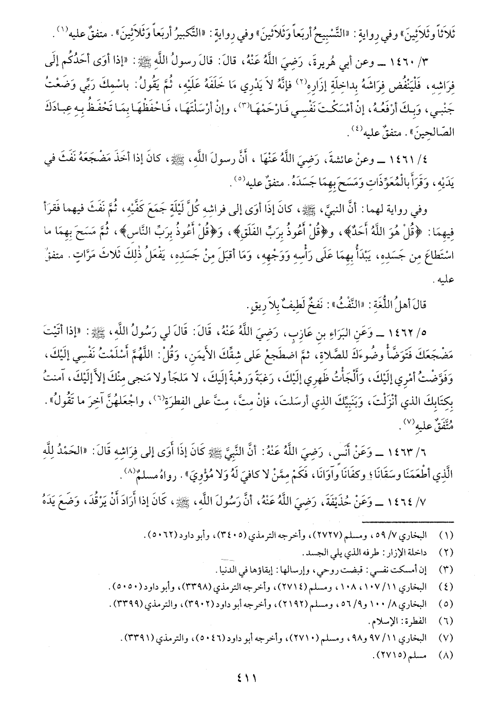 5/1462- وَعنِ البرَاءِ بنِ عازِبٍ، رَضِيَ اللَّه عنْهمَا، قَالَ: قَالَ لي رسُولُ اللَّهِ صَلّى اللهُ عَلَيْهِ وسَلَّم: "إِذَا أَتَيتَ مَضْجَعَكَ فَتَوضَّأْ وضُوءَكَ لِلصَّلاةِ، ثُمَّ اضْطَجِعْ عَلى شِقِّكَ الأَيمَنِ، وقلْ: اللَّهُمَّ أَسْلَمْتُ نفِسي إِلَيكَ، وَفَوَّضتُ أَمري إِلَيْكَ، وَأَلَجَأْتُ ظَهرِي إِلَيْكَ، رغبةً ورهْبَةً إِلَيْكَ، لامَلجأَ ولا مَنجي مِنْكَ إِلاَّ إِليكَ، آمنتُ بِكِتَابِكَ الذِي أَنزَلْت، وَبِنَبِيِّكَ الذِي أَرسَلتَ، فإِنْ مِتَّ. مِتَّ عَلَى الفِطرةِ، واجْعَلهُنَّ آخِرَ مَا تَقُولُ" مُتَّفقٌ عليهِ.