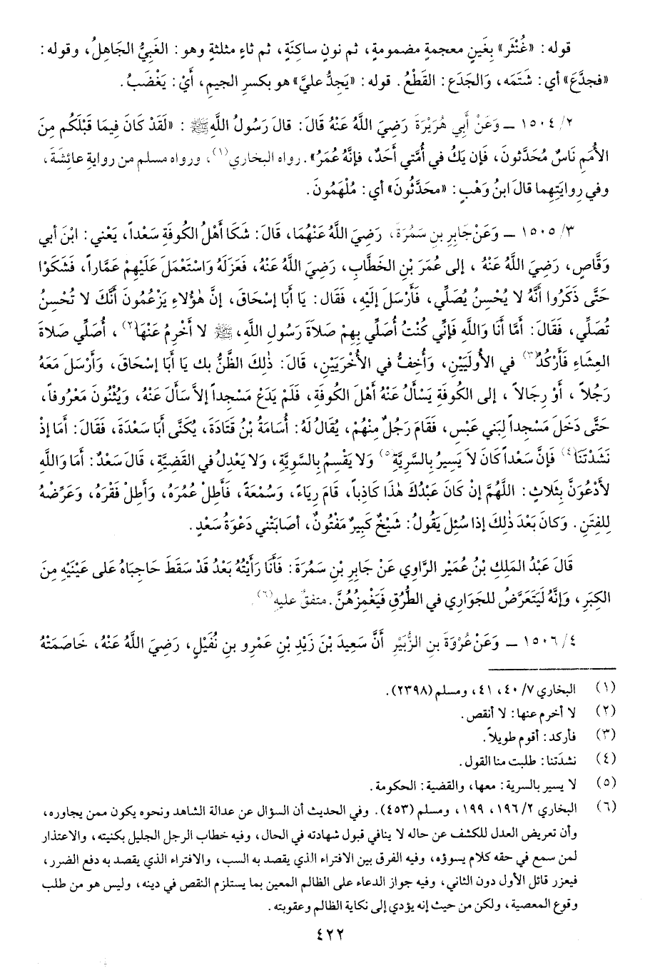 3/1505- وعنْ جَابِر بنِ سمُرَةَ، رضي اللَّه عَنْهُمَا. قَالَ: شَكَا أهْلُ الكُوفَةِ سَعْداً، يَعْنِي: ابْنِ أَبي وَقَّاصٍ، رضي اللَّه عَنْهُ، إِلَى عُمَرَ بنِ الخَطَّابِ، رضي اللَّه عَنْهُ، فَعزَلَه وَاسْتَعْمَلَ عَلَيْهِمْ عمَّاراً، فَشَكَوْا حَتَّى ذكَرُوا أَنَّهُ لا يُحْسِنُ يُصَلِّي، فَأْرسَلَ إلَيْهِ، فَقَالَ: ياأَبا إسْحاقَ، إنَّ هؤُلاءِ يزْعُمُونَ أنَّكَ لا تُحْسِنُ تُصَلِّي. فَقَالَ: أمَّا أَنَا واللَّهِ فَإنِّي كُنْتُ أُصَلِّي بِهمْ صَلاةَ رَسُولِ اللَّه صَلّى اللهُ عَلَيْهِ وسَلَّم لا أَخْرِمُ عَنْهَا أُصَلِّي صَلاةَ العِشَاءِ فَأَرْكُدُ فِي الأُولَيَيَنِ، وَأُخِفُّ في الأُخْرَييْنِ، قَالَ: ذَلِكَ الظَنُّ بكَ يَا أبَا إسْحاقَ، وأَرسلَ مَعَهُ رَجُلاً أَوْ رجَالاً إلَى الكُوفَةِ يَسْأَلُ عَنْهُ أَهْلَ الكُوفَةِ، فَلَمْ يَدَعْ مَسْجِداً إلاَّ سَأَلَ عَنْهُ، وَيُثْنُونَ مَعْرُوفاً، حَتَّى دَخَلَ مَسْجِداً لِبَني عَبْسٍ، فَقَامَ رَجُلٌ مِنْهُمْ، يُقَالُ لَهُ أُسامةُ بنُ قَتَادَةَ، يُكَنَّى أَبَا سَعْدَةَ، فَقَالَ: أَمَا إذْ نَشَدْتَنَا فَإنَّ سَعْداً كانَ لا يسِيرُ بِالسَّرِيّةِ وَلاَ يَقْسِمُ بِالسَّويَّةِ، وَلا يعْدِلُ في القَضِيَّةِ، قَالَ سعْدٌ: أَمَا وَاللَّهِ لأدْعُوَنَّ بِثَلاثٍ: اللَّهُمَّ إنْ كَانَ عبْدكَ هَذَا كَاذِباً، قَام رِيَآءً، وسُمْعَةً، فَأَطِلْ عُمُرَهُ، وَأَطِلْ فَقْرَهُ، وَعَرِّضْهُ للفِتَنِ، وَكَانَ بَعْدَ ذلكَ إِذَا سُئِلَ يَقُولُ: شَيْخٌ كَبِيرٌ مَفْتُون، أصَابتْني دَعْوةُ سعْدٍ.