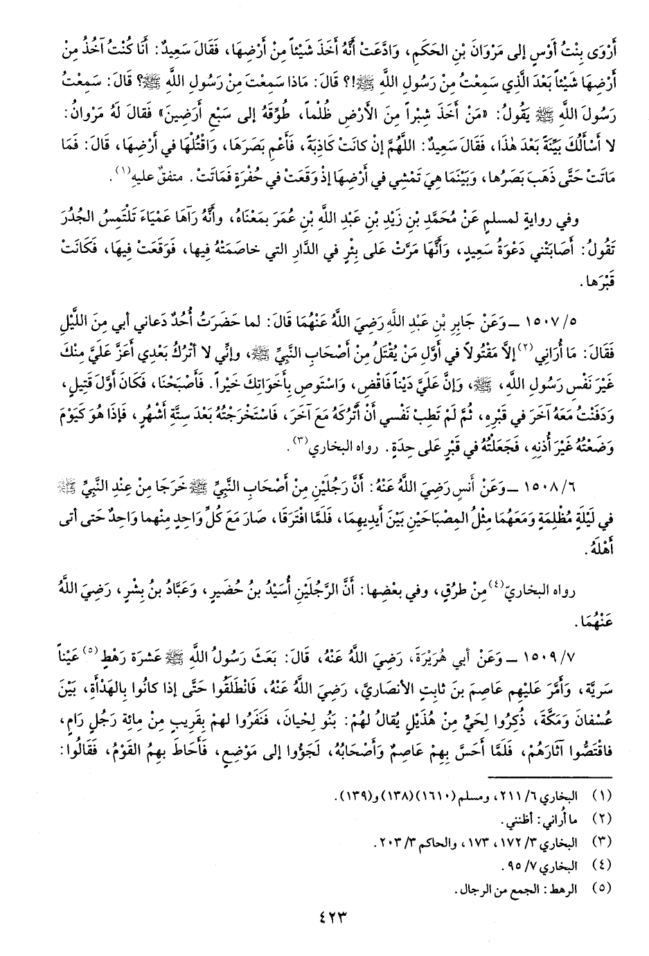 7/1509- وعنْ أَبي هُرَيْرةَ، رضي اللَّه عَنْهُ، قَال: بَعثَ رَسُولُ اللِّهِ صَلّى اللهُ عَلَيْهِ وسَلَّم عَشَرَةَ رهْطٍ عَيْناً سَريَّةً، وأمَّرَ عليْهِم عَاصِمَ بنَ ثابِتٍ الأنصاريَّ، رضي اللَّه عنْهُ، فَانطَلَقُوا حتَّى إِذَا كانُوا بالهَدْأةِ، بيْنَ عُسْفانَ ومكَّةَ، ذُكِرُوا لَحِيِّ منْ هُذَيْلٍ يُقالُ لهُمْ: بنُوا لِحيَانَ، فَنَفَرُوا لهمْ بقَريب منْ مِائِةِ رجُلٍ رَامٍ فَاقْتَصُّوا آثَارَهُمْ، فَلَمَّا أحَسَّ بهِمْ عاصِمٌ ؤَأصحابُهُ، لجَأوا إِلَى مَوْضِعٍ، فَأحاطَ بهمُ القَوْمُ، فَقَالُوا: