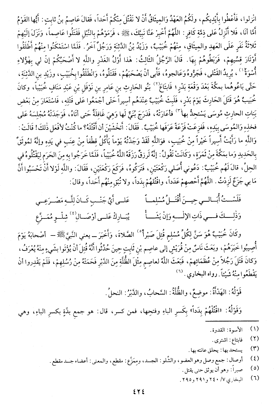 انْزلوا، فَأَعْطُوا بأيْدِيكُمْ ولكُم العَهْدُ والمِيثاق أنْ لا نَقْتُل مِنْكُم أحَداً، فَقَالَ عَاصِمُ بنُ ثَابِتٍ: أَيُّهَا القومُ، أَمَّا أَنَا فَلاَ أَنْزِلُ عَلَى ذِمةِ كَافرٍ. اللهمَّ أخْبِرْ عَنَّا نَبِيَّكَ صَلّى اللهُ عَلَيْهِ وسَلَّم فَرمَوْهُمْ بِالنَّبْلِ فَقَتَلُوا عَاصِماً، ونَزَل إلَيْهِمْ ثَلاثَةُ نَفَرٍ عَلَى العهدِ والمِيثاقِ، مِنْهُمْ خُبيْبٌ، وزَيْدُ بنُ الدَّثِنِة ورَجُلٌ آخَرُ، فَلَمَّا اسْتَمْكَنُوا مِنْهُمْ أطْلَقُوا أوْتَار قِسِيِّهمْ، فرَبطُوهُمْ بِها، قَال الرَّجلُ الثَّالِثُ: هَذَا أوَّلُ الغَدْرِ واللَّهِ لا أصحبُكمْ إنَّ لِي بهؤلاءِ أُسْوةً، يُريدُ القَتْلى، فَجرُّوهُ وعَالَجُوهُ، فَأبي أنْ يَصْحبَهُمْ، فَقَتَلُوهُ، وانْطَلَقُوا بخُبَيْبٍ، وَزيْدِ بنِ الدَّثِنَةِ، حَتَّى بَاعُوهُما بمكَّةَ بَعْد وَقْعةِ بدرٍ، فَابتَاعَ بَنُو الحارِثِ ابنِ عامِرِ بنِ نوْفَلِ بنِ عَبْدِ مَنَافٍ خُبَيْباً، وكانَ خُبَيبُ هُوَ قَتَل الحَارِثَ يَوْمَ بَدْرٍ، فلَبِثَ خُبيْبٌ عِنْدهُم أسِيراً حَتى أجْمَعُوا عَلَى قَتْلِهِ، فَاسْتَعارَ مِنْ بعْضِ بنَاتِ الحارِثِ مُوسَى يَسْتحِدُّ بهَا فَأَعَارَتْهُ، فَدَرَجَ بُنَيُّ لهَا وَهِي غَافِلةٌ حَتى أَتَاهُ، فَوَجَدْتُه مُجْلِسَهُ عَلى فَخذِهِ وَالمُوسَى بِيده، فَفَزِعتْ فَزْعَةً عَرَفَهَا خُبَيْبٌ، فَقَال: أتَخْشيْنَ أن أقْتُلَهُ مَا كُنْتُ لأفْعل ذلكَ، قَالَتْ: وَاللَّهِ مَا رأيْتُ أسِيراً خَيْراً مِنْ خُبيبٍ، فواللَّهِ لَقَدْ وَجدْتُهُ يوْماً يأَكُلُ قِطْفاً مِنْ عِنبٍ في يدِهِ، وإنَّهُ لمُوثَقٌ بِالحديدِ وَما بمَكَّةَ مِنْ ثمَرَةٍ، وَكَانَتْ تقُولُ: إنَّهُ لَرزقٌ رَزقَهُ اللَّه خُبَيباً، فَلَمَّا خَرجُوا بِهِ مِنَ الحَرمِ لِيقْتُلُوهُ في الحِلِّ، قَال لهُم خُبيبُ: دعُوني أُصلي ركعتَيْنِ، فتَرَكُوهُ، فَركعَ رَكْعَتَيْنِ، فقالَ: واللَّهِ لَوْلا أنْ تَحسَبُوا أنَّ مابي جزَعٌ لَزِدْتُ: اللَّهُمَّ أحْصِهمْ عَدَداً، واقْتُلهمْ بَدَداً، وَلاَ تُبْقِ مِنْهُم أَحَداً. وقال: